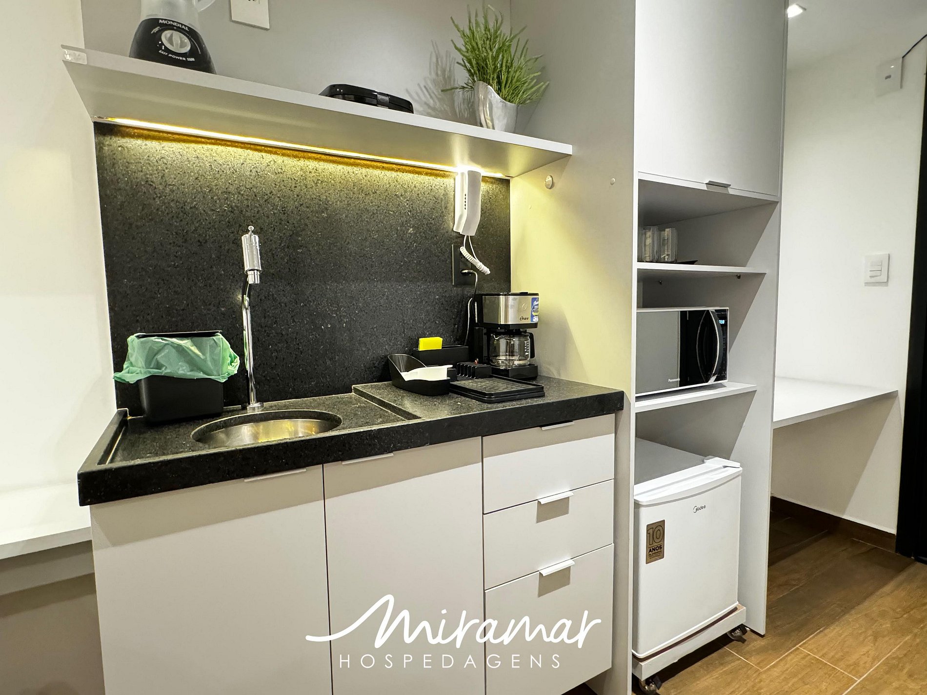 Na cozinha compacta, você encontrará todos os eletrodomésticos necessários para preparar refeições práticas, como frigobar, micro-ondas, sanduicheira e liquidificador