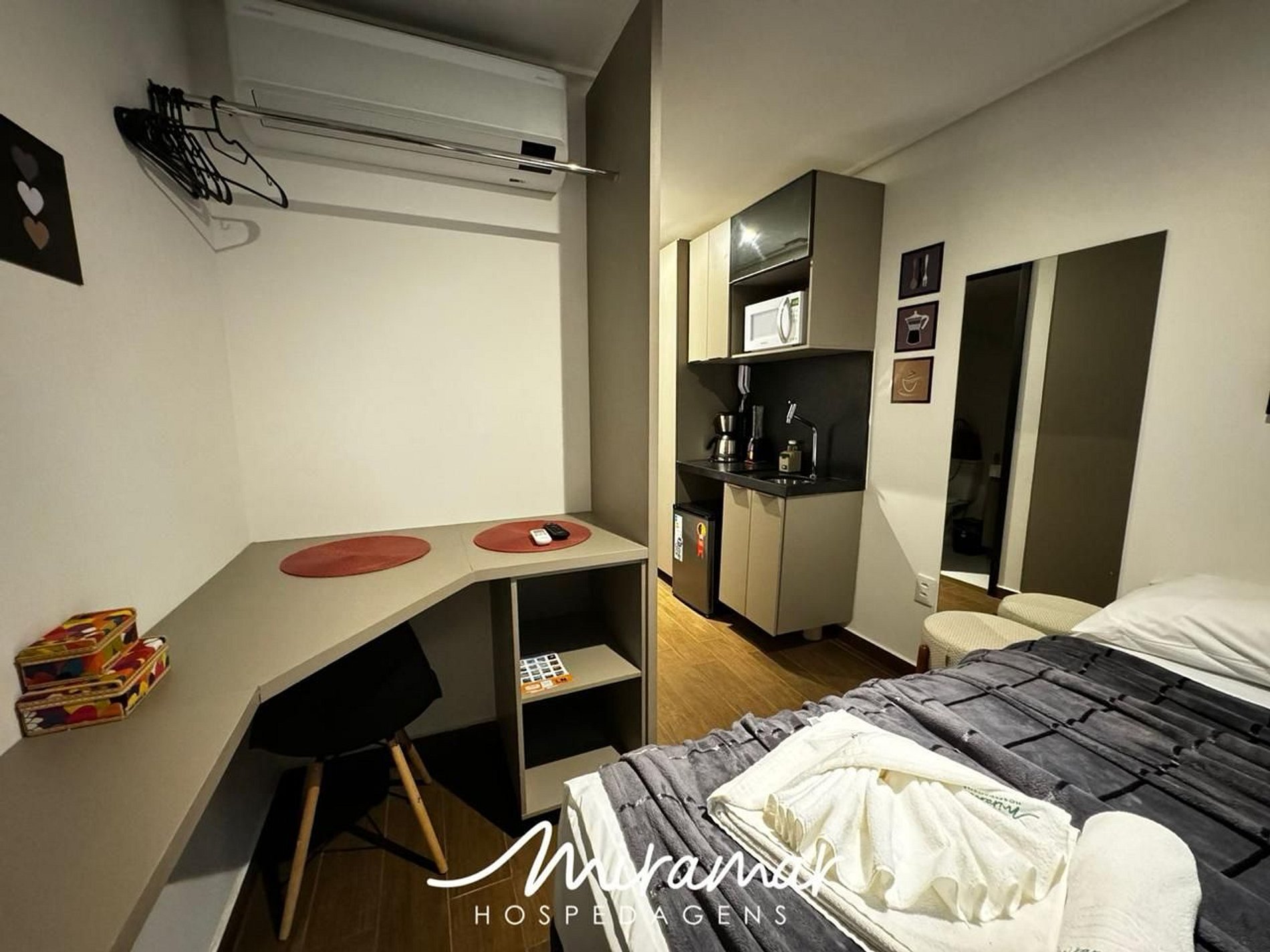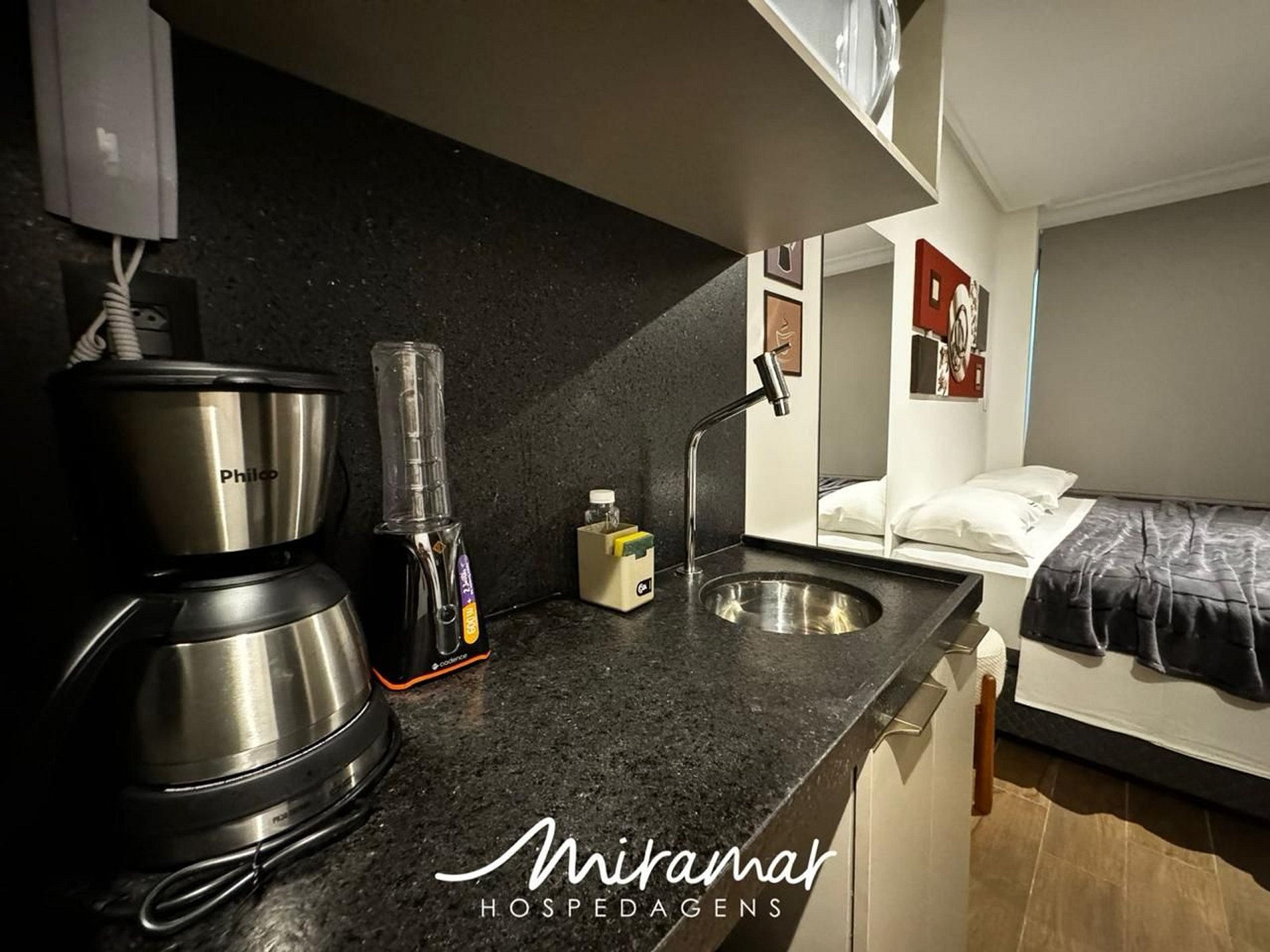 A cozinha compacta inclui frigobar, micro-ondas e sanduicheira.