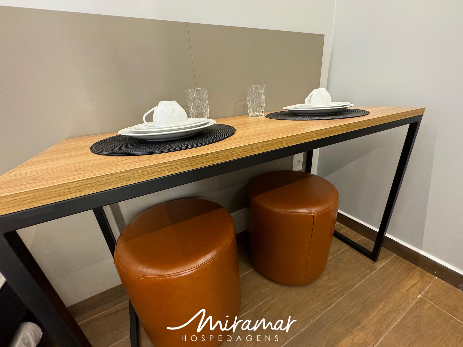 Na cozinha compacta, você encontrará todos os eletrodomésticos necessários para preparar refeições práticas, como micro-ondas, cafeteira, frigobar, sanduicheira e liquidificador. Para seu conforto, a unidade também dispõe de ferro de passar roupas e secador de cabelo.