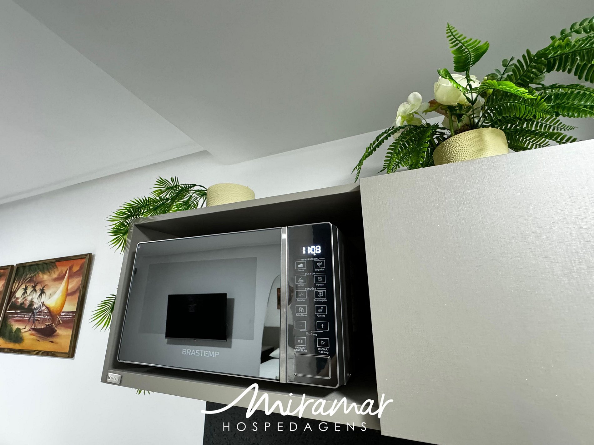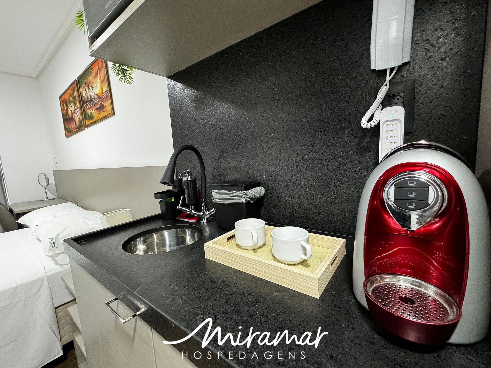 Na cozinha compacta, você encontrará todos os eletrodomésticos necessários para preparar refeições práticas, como cafeteira, micro-ondas e frigobar.
