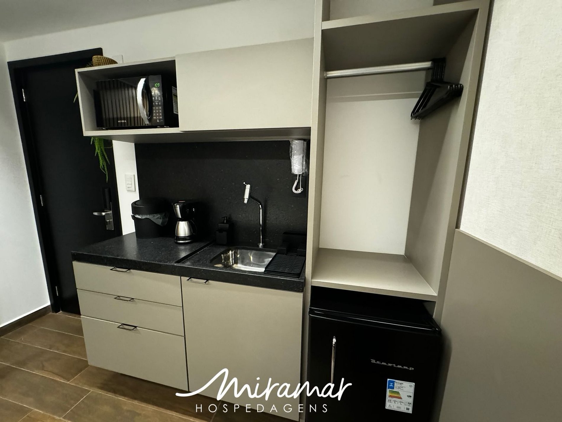 Na cozinha, você encontrará os eletrodomésticos essenciais, como cafeteira, micro-ondas, sanduicheira e frigobar, ideais para preparar refeições rápidas. O banheiro é espaçoso e conta com um secador de cabelo, garantindo praticidade durante sua estadia.
