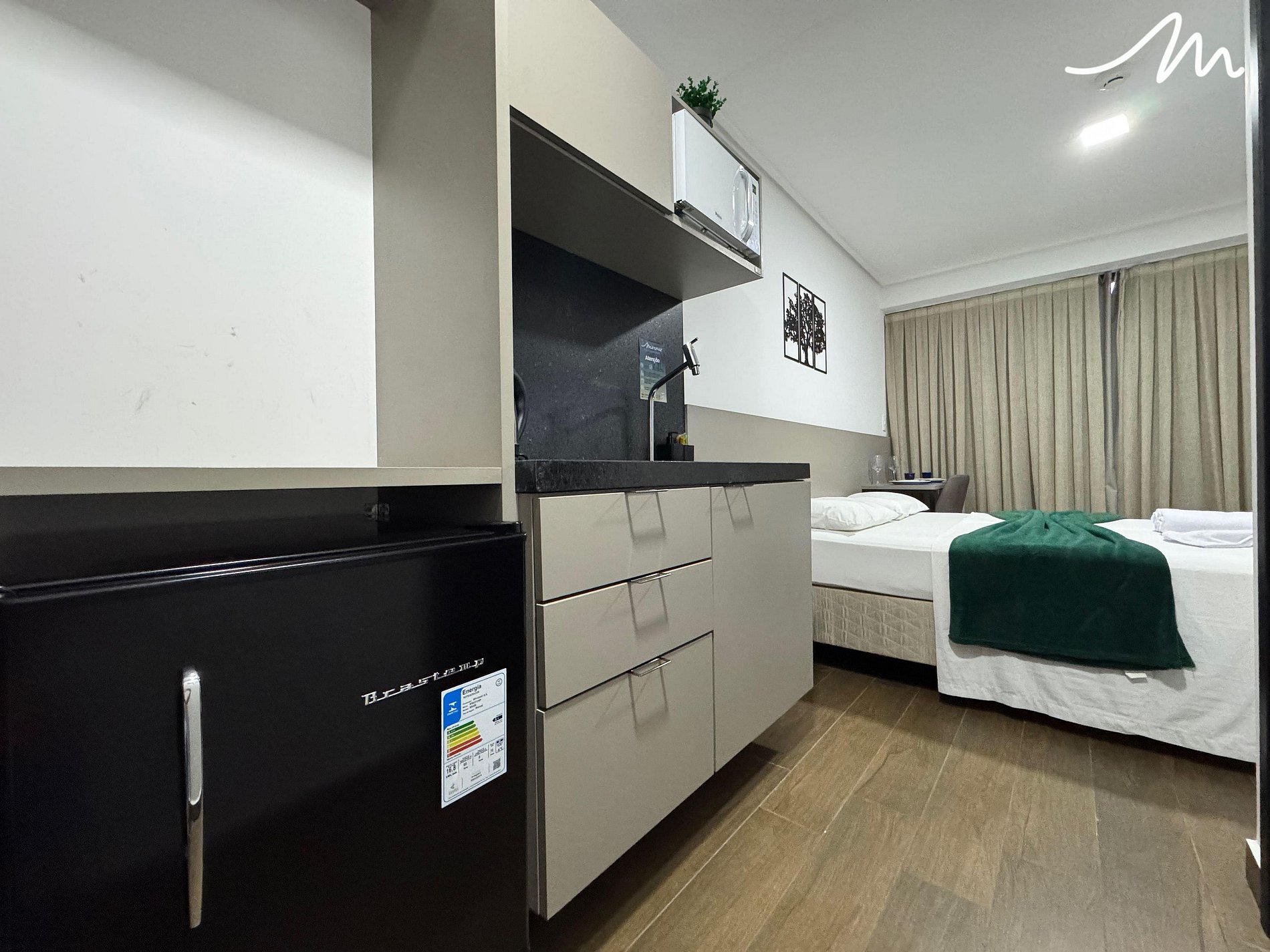 Na cozinha compacta, você encontrará todos os eletrodomésticos necessários para preparar refeições práticas, como liquidificador, frigobar, micro-ondas e sanduicheira.