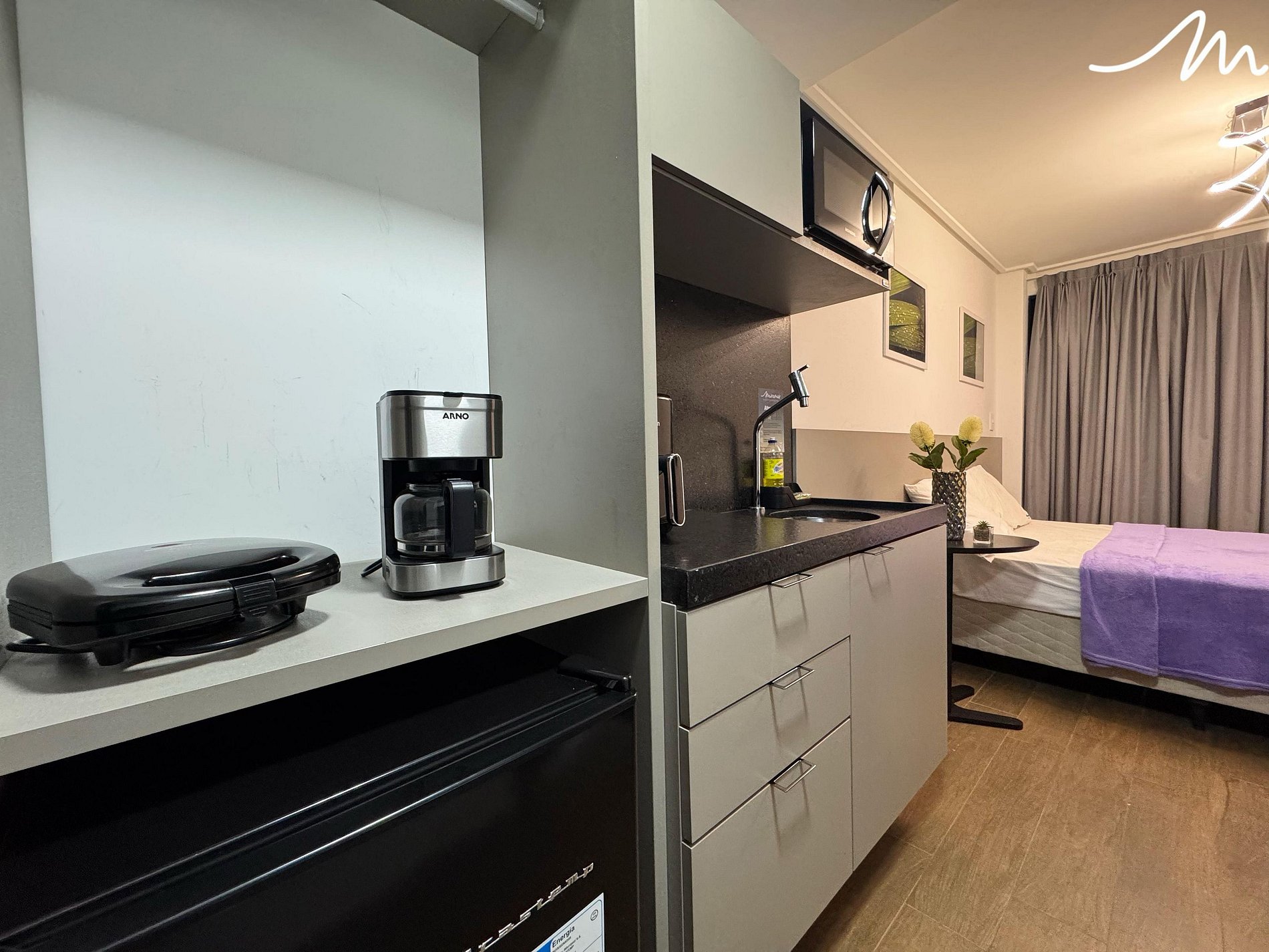 Na cozinha compacta, você encontrará todos os eletrodomésticos necessários para preparar refeições práticas, cafeteira, frigobar e air fryer.
