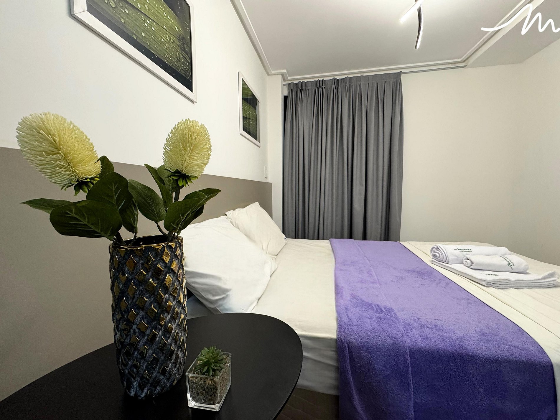 Este flat é perfeito para acomodar até 2 pessoas, oferecendo um ambiente aconchegante e climatizado com ar-condicionado. Acomodação com cama de casal e travesseiros, disponíveis de acordo a quantidade de hóspedes que o flat acomoda (2).