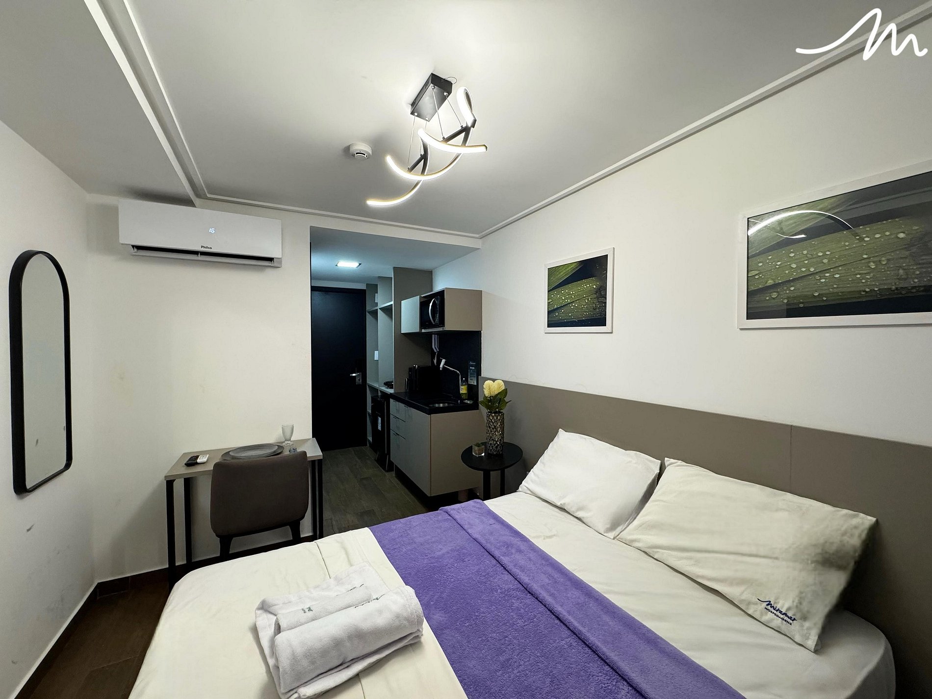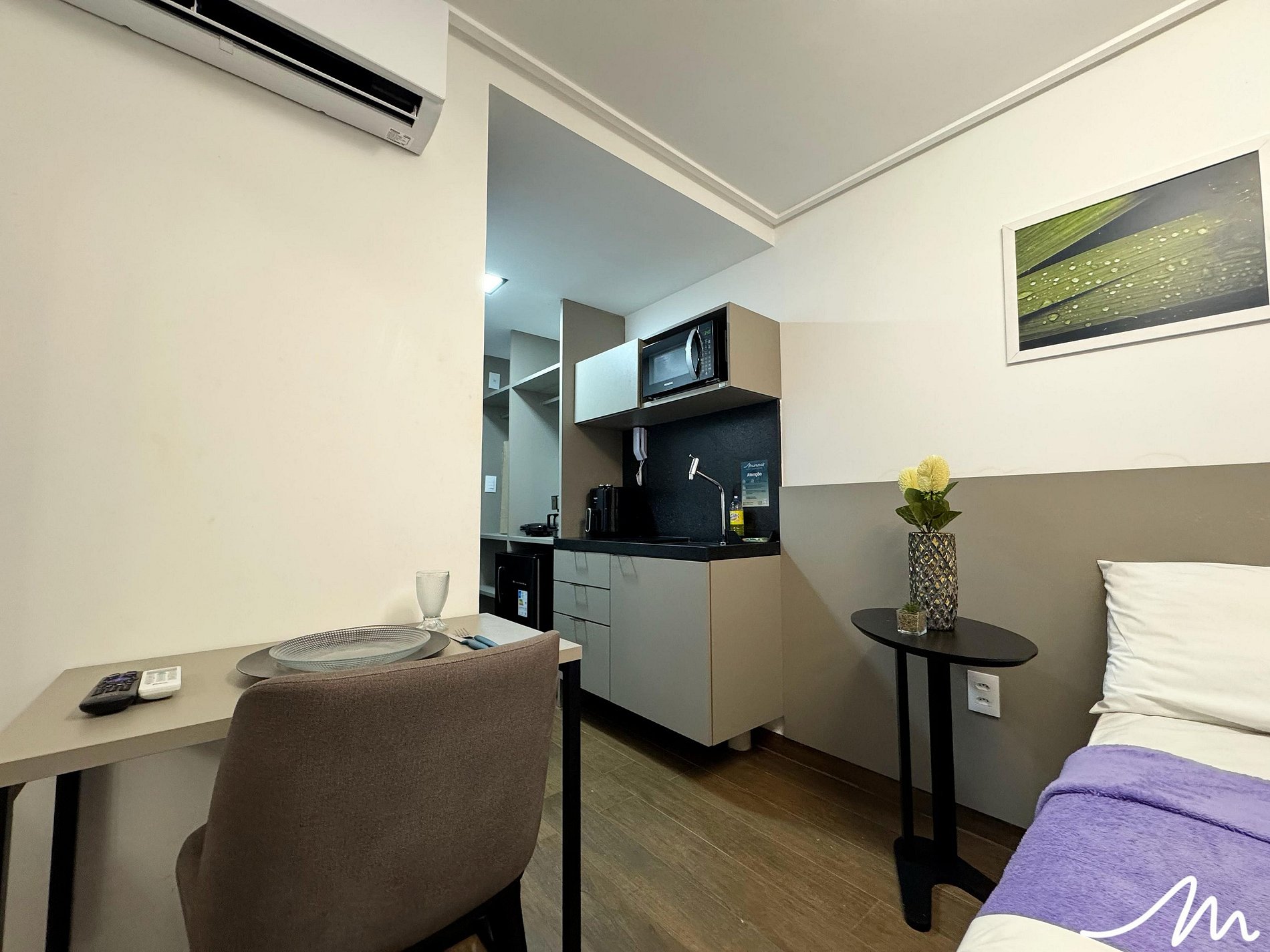 Nosso flat oferece uma estadia confortável com uma cama de casal , uma TV e ar-condicionado, garantindo entretenimento e relaxamento. Equipado com utensílios essenciais como cafeteira, air fryer, micro-ondas e frigobar, o espaço é ideal para preparar refeições rápidas. Combinando conveniência e conforto, o flat proporciona uma experiência de estadia verdadeiramente excepcional.