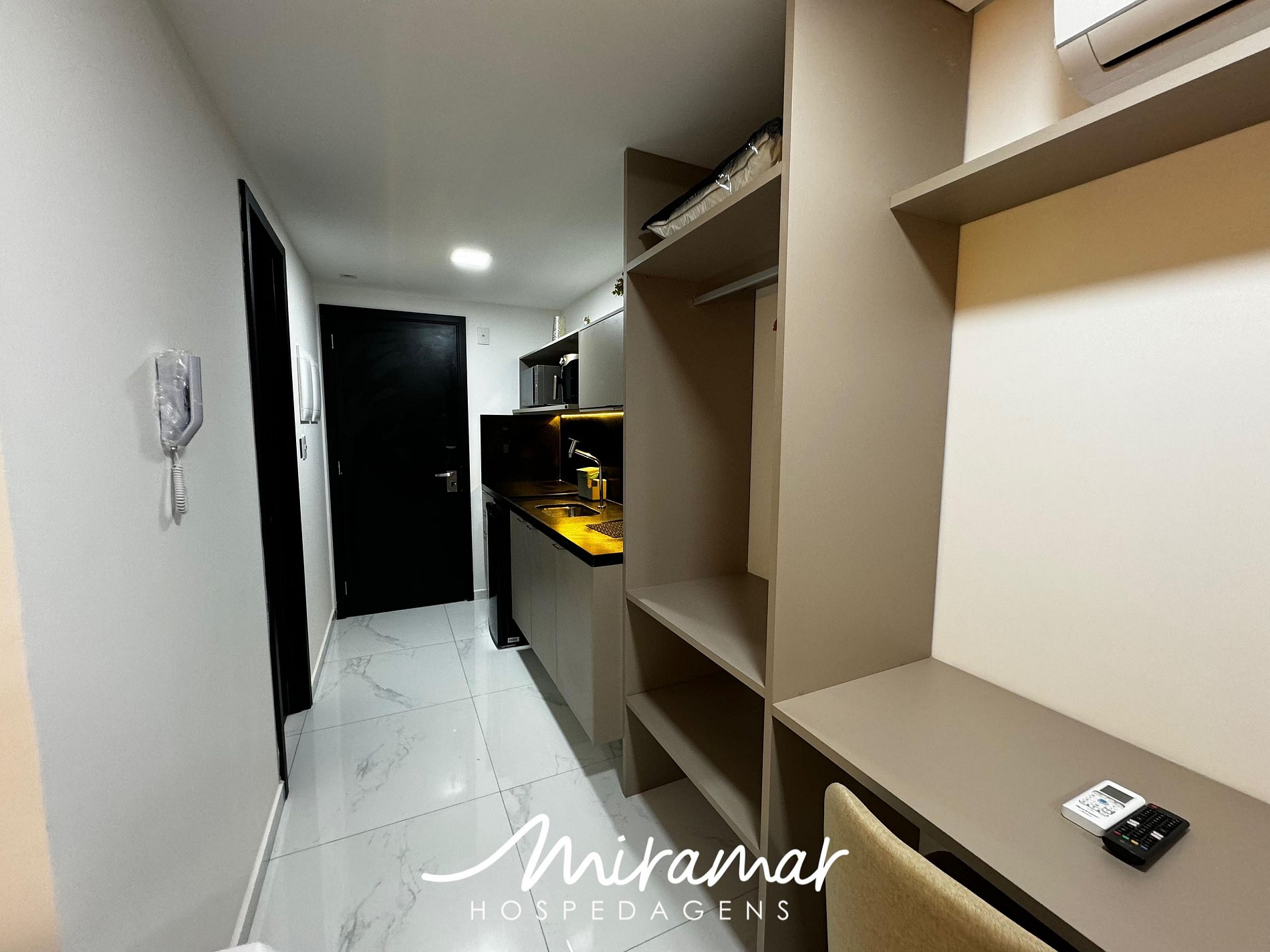 A cozinha compacta inclui frigobar, micro-ondas, airfryer, cafeteira, liquidificador e sanduicheira.