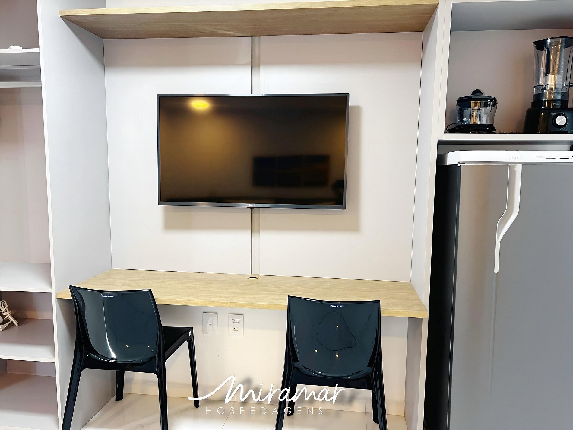 A cozinha inclui eletrodomésticos como geladeira, micro-ondas, sanduicheira, cafeteira e pipoqueira, o espaço é ideal para preparar refeições rápidas e saborosas com facilidade. O filtro de água, que também fornece água gelada, garante sempre água purificada e de qualidade.