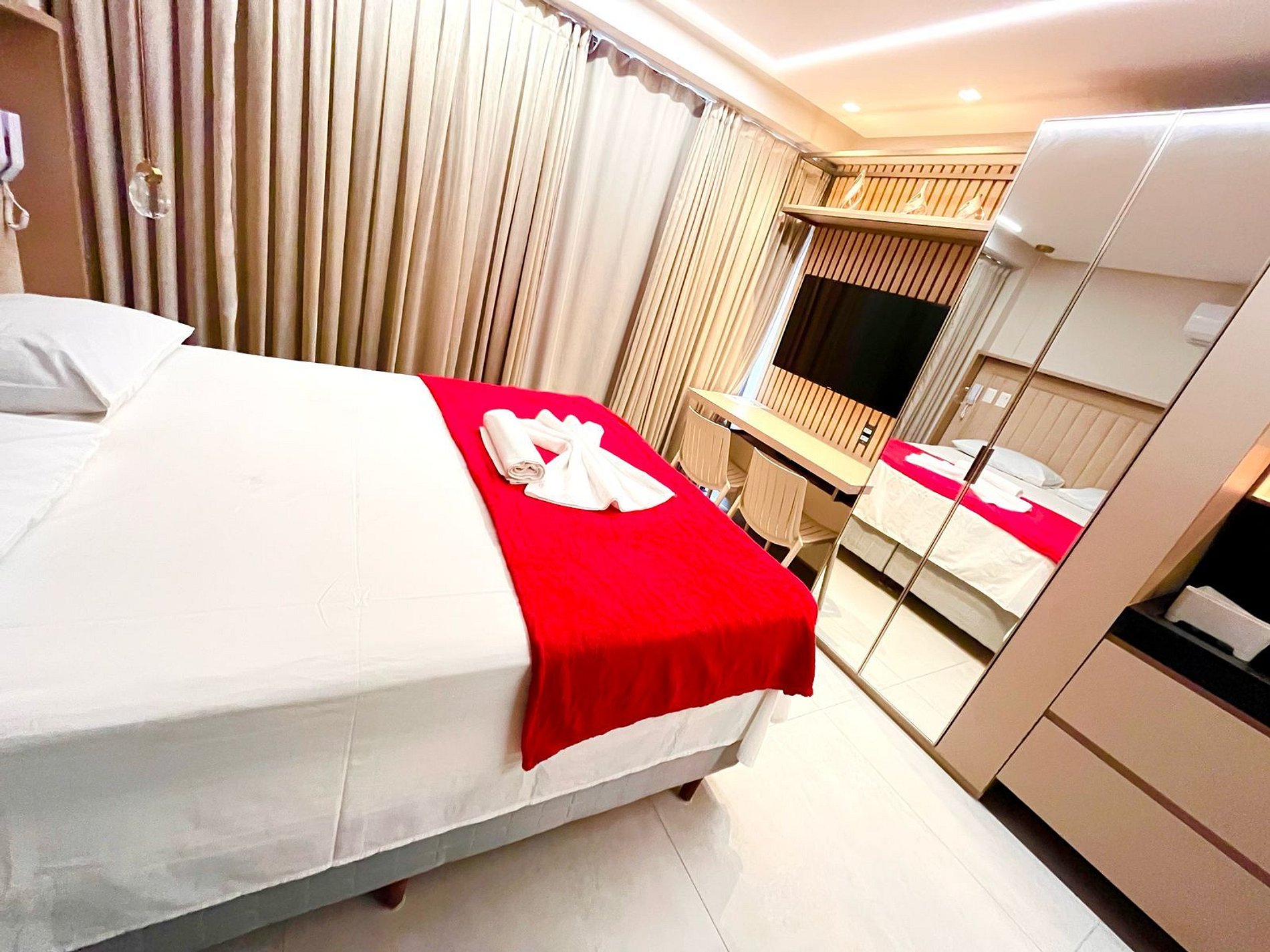 O apartamento conta com uma cama de casal aconchegante, garantindo noites de sono revigorantes. Para o seu entretenimento, há uma Smart TV e acesso Wi-Fi, perfeitos para momentos de lazer. A cozinha moderna é equipada com frigobar, airfryer, liquidificador e micro-ondas, facilitando a preparação de refeições rápidas e práticas. Também disponibilizamos enxoval de cama, com lençóis e toalhas, e utensílios domésticos essenciais, para que você possa aproveitar suas refeições com conforto.