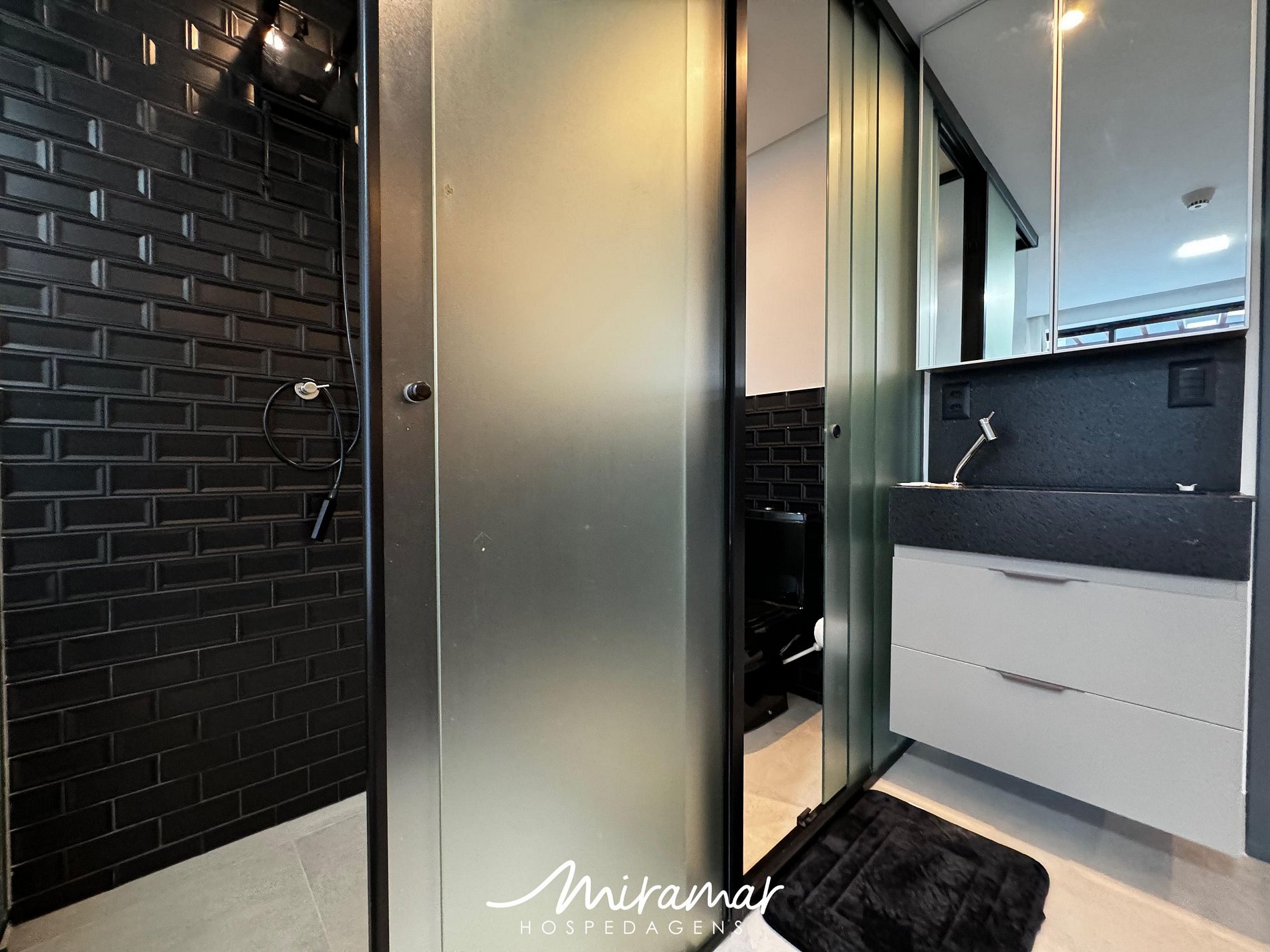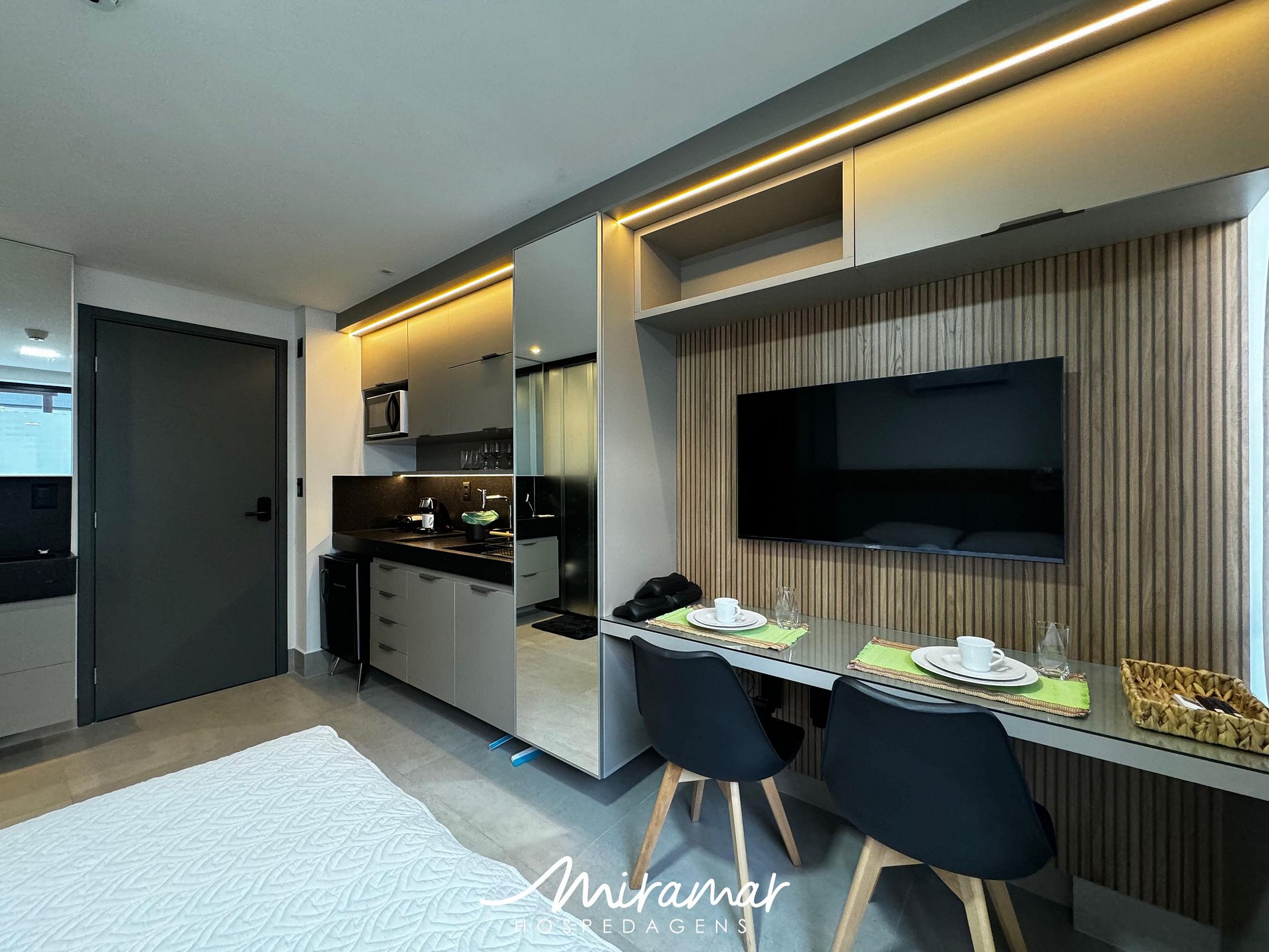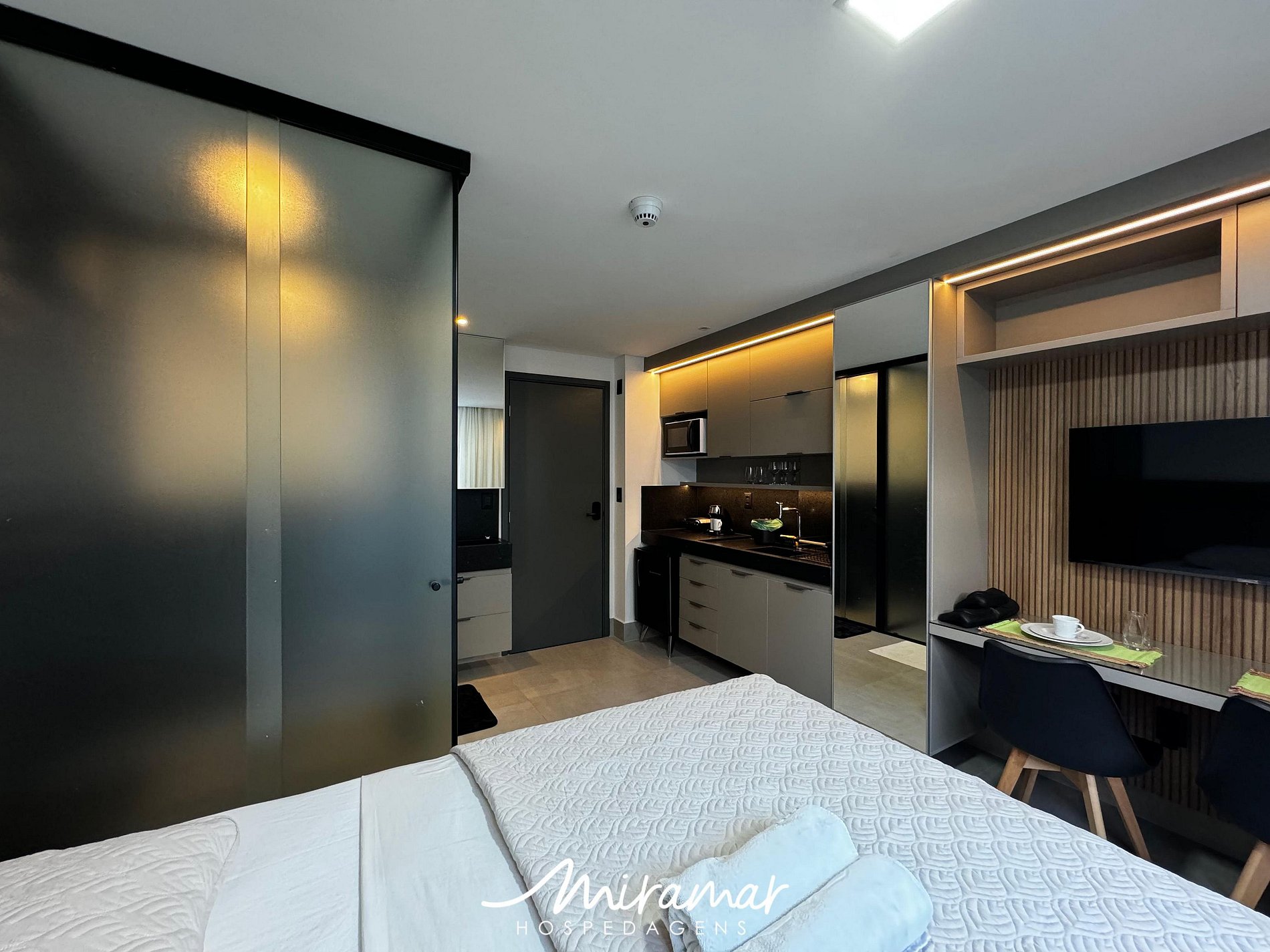 A 50 metros da praia, esse maravilhoso flat está bem distruido em um ambiente único composto por uma cozinha compacta, com todos os amenities necesários para uma estadia confortável, uma cama de casal acompanhada por iluminação para leitura que dá um toque aconchegante na luz ambiente, chuveiro separado do sanitario com ducha quente para maior comodidade e o grande diferencial.
