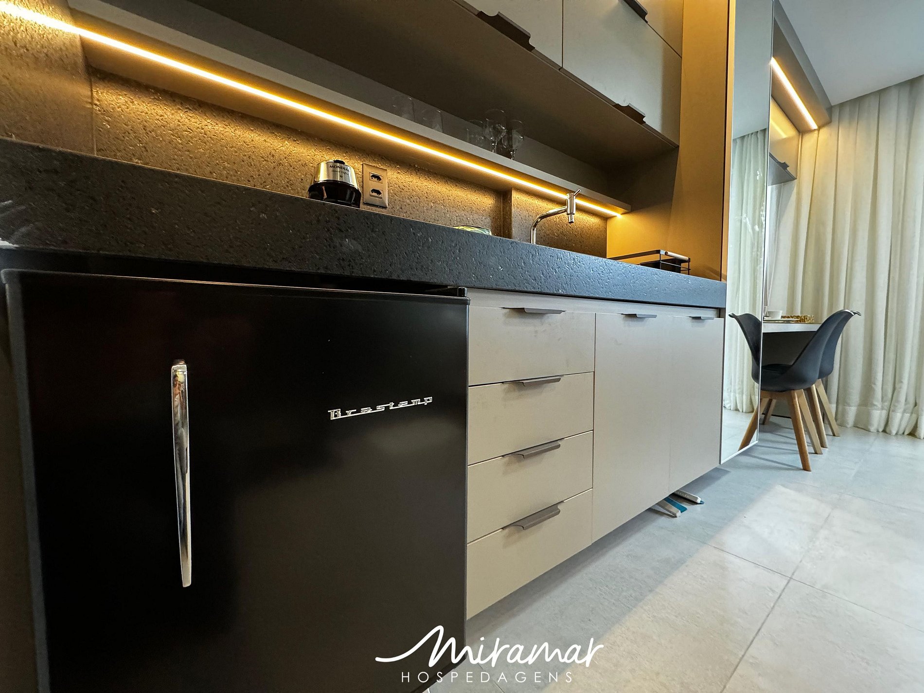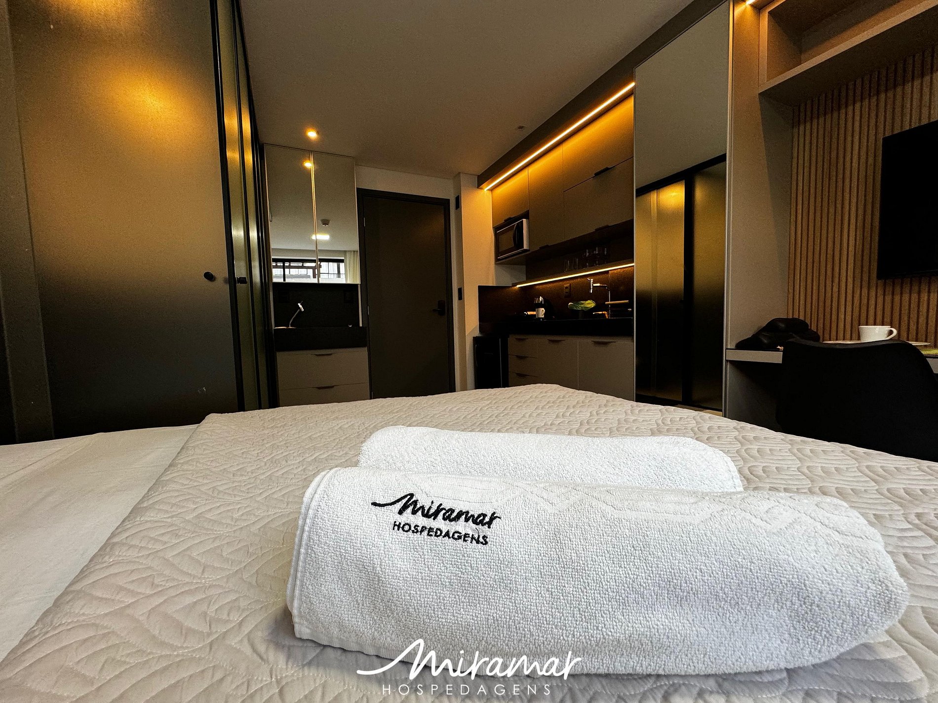 A 50 metros da praia, esse maravilhoso flat está bem distruido em um ambiente único composto por uma cozinha compacta, com todos os amenities necesários para uma estadia confortável, uma cama de casal acompanhada por iluminação para leitura que dá um toque aconchegante na luz ambiente, chuveiro separado do sanitario com ducha quente para maior comodidade e o grande diferencial.