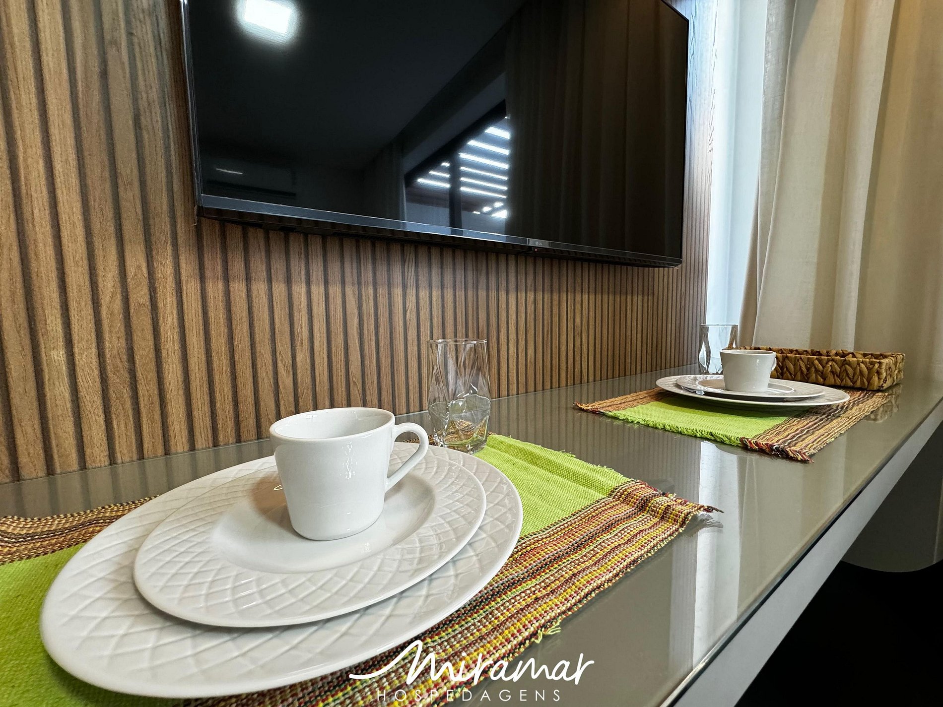 O flat oferece uma cama de casal aconchegante, garantindo noites de sono revigorantes. Para o seu entretenimento, há uma Smart TV e acesso Wi-Fi, perfeitos para momentos de lazer. A cozinha moderna é equipada com frigobar, micro-ondas e assadeira, facilitando a preparação de refeições rápidas e práticas, a decoração do quarto é moderna e aconchegante. Além disso, oferecemos enxoval de cama, com lençóis e toalhas e utensílios domésticos, para que você possa preparar e desfrutar das suas refeições com conforto.