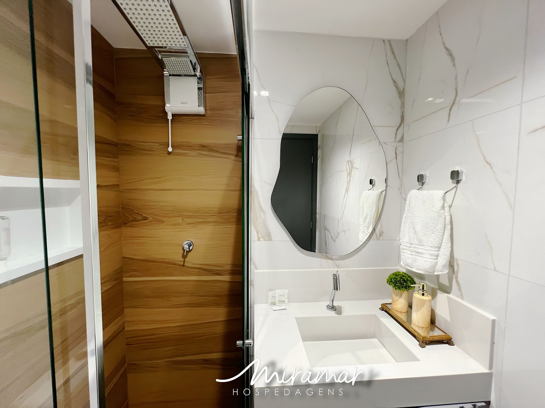 O apartamento oferece dois quartos: uma suíte e um quarto adicional, ambos com cama de casal, ar-condicionado e TV, proporcionando o descanso e a privacidade que você merece. Os banheiros modernos, com bancada em mármore branco e excelente iluminação, completam a experiência.