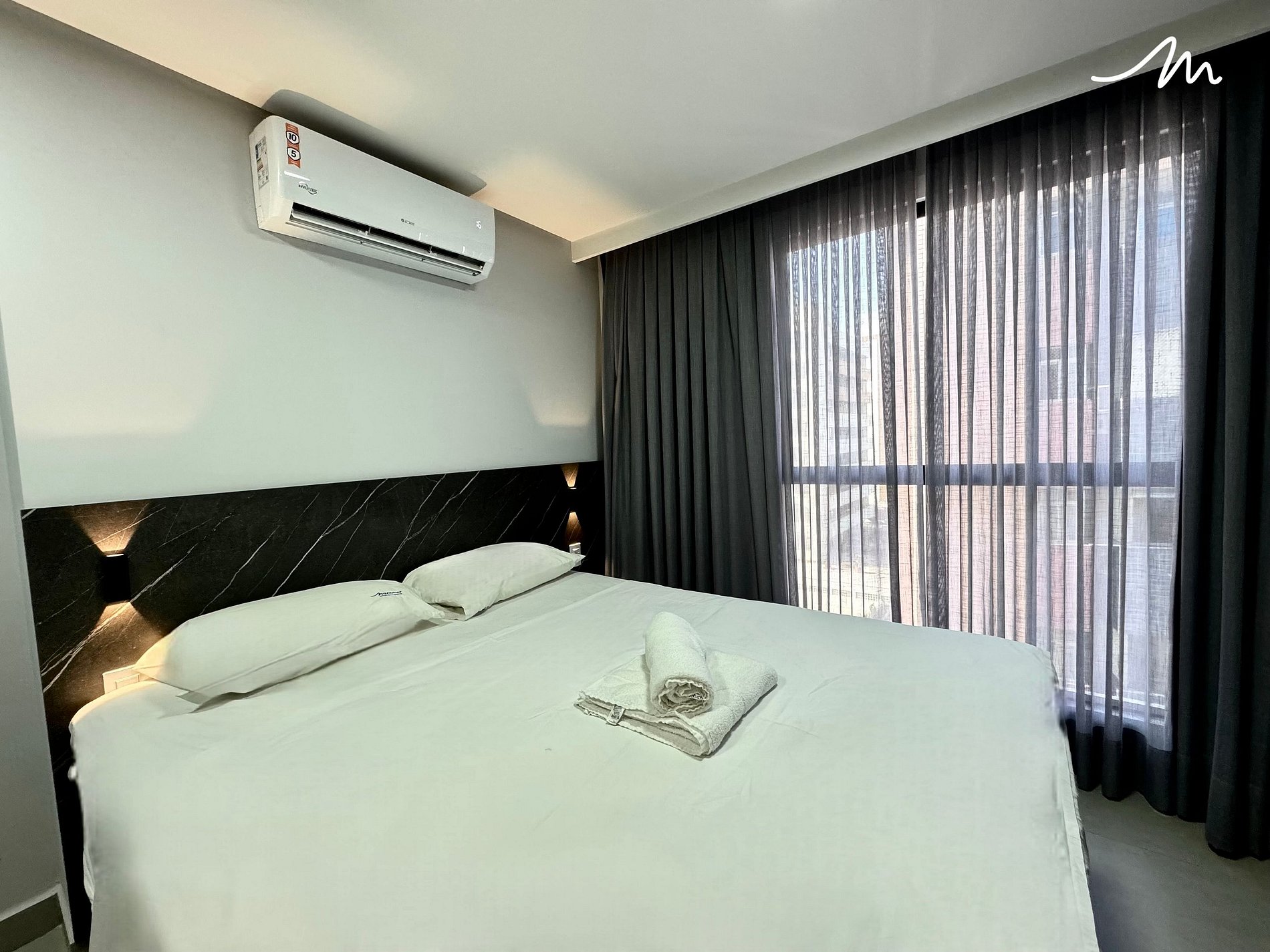 Este charmoso flat oferece todo o conforto para sua estadia, com ar-condicionado, cama de casal, cama auxiliar de solteiro e TV. Ideal para até 3 pessoas, o ambiente conta com armário para roupas, cabide, e cortinas blackout, garantindo um sono tranquilo ou, se preferir, iluminação natural durante o dia. O banheiro é acolhedor, com espelho e chuveiro elétrico.