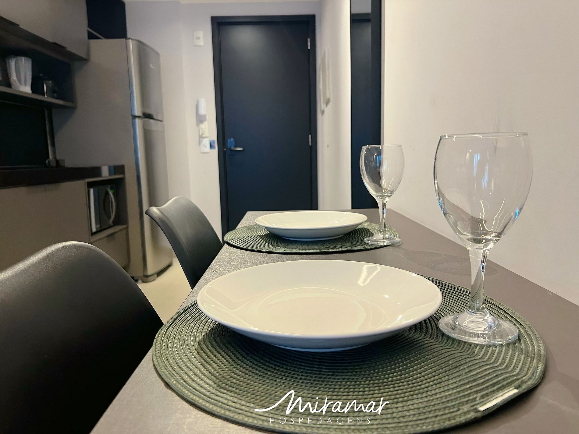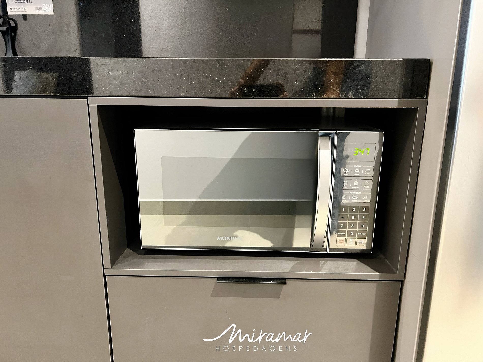 A cozinha, embora compacta, é bem equipada com micro-ondas, chaleira elétrica, sanduicheira, geladeira e liquidificador. Os talheres – como colheres, garfos e facas – são disponibilizados de acordo com o número de hóspedes, oferecendo praticidade nas refeições.