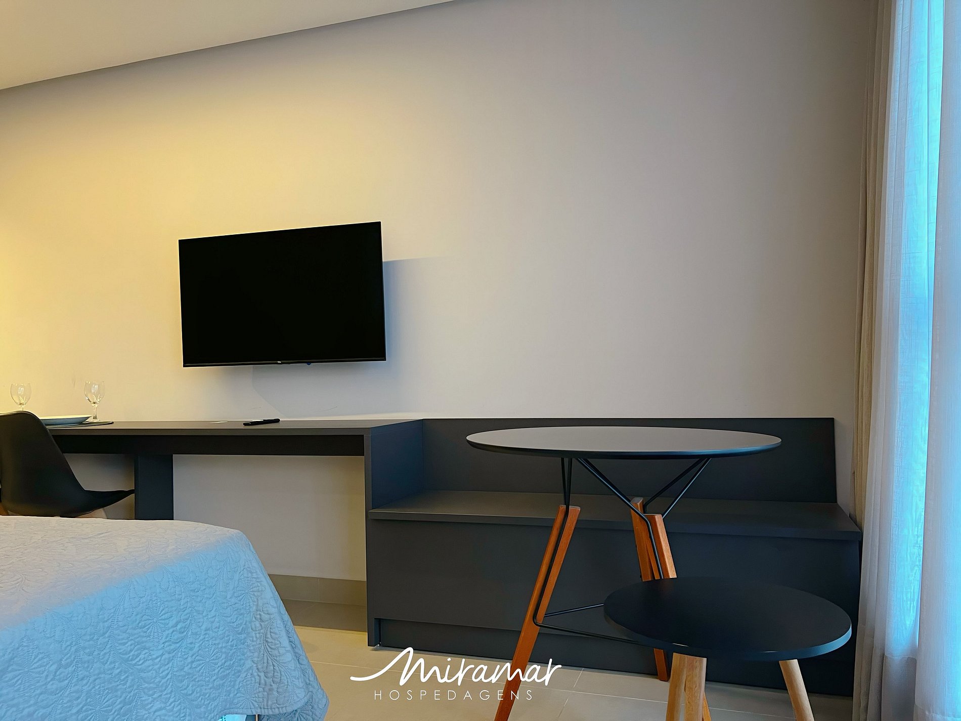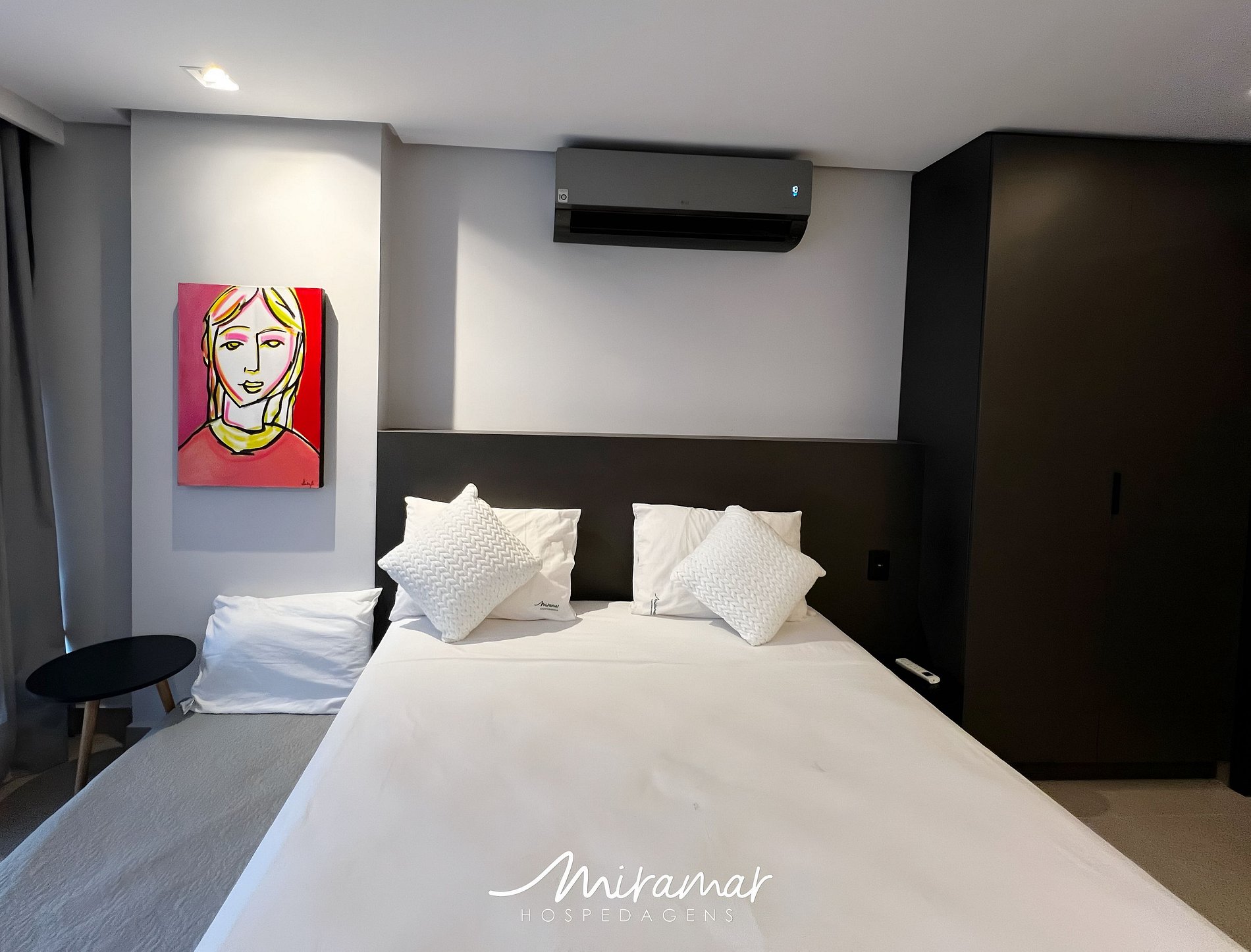 Este flat com climatização oferece todo o conforto necessário para a sua estadia. Ele conta com ar-condicionado, cama de casal e uma cama auxiliar de solteiro, TV e uma mesa ideal para refeições. Com capacidade para até 3 pessoas, o espaço possui um guarda-roupas planejado, facilitando a organização dos seus pertences. O banheiro é acolhedor, equipado com espelho e chuveiro elétrico.