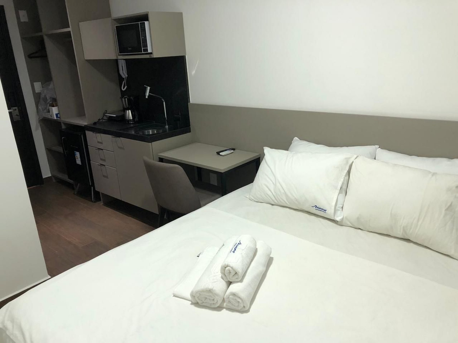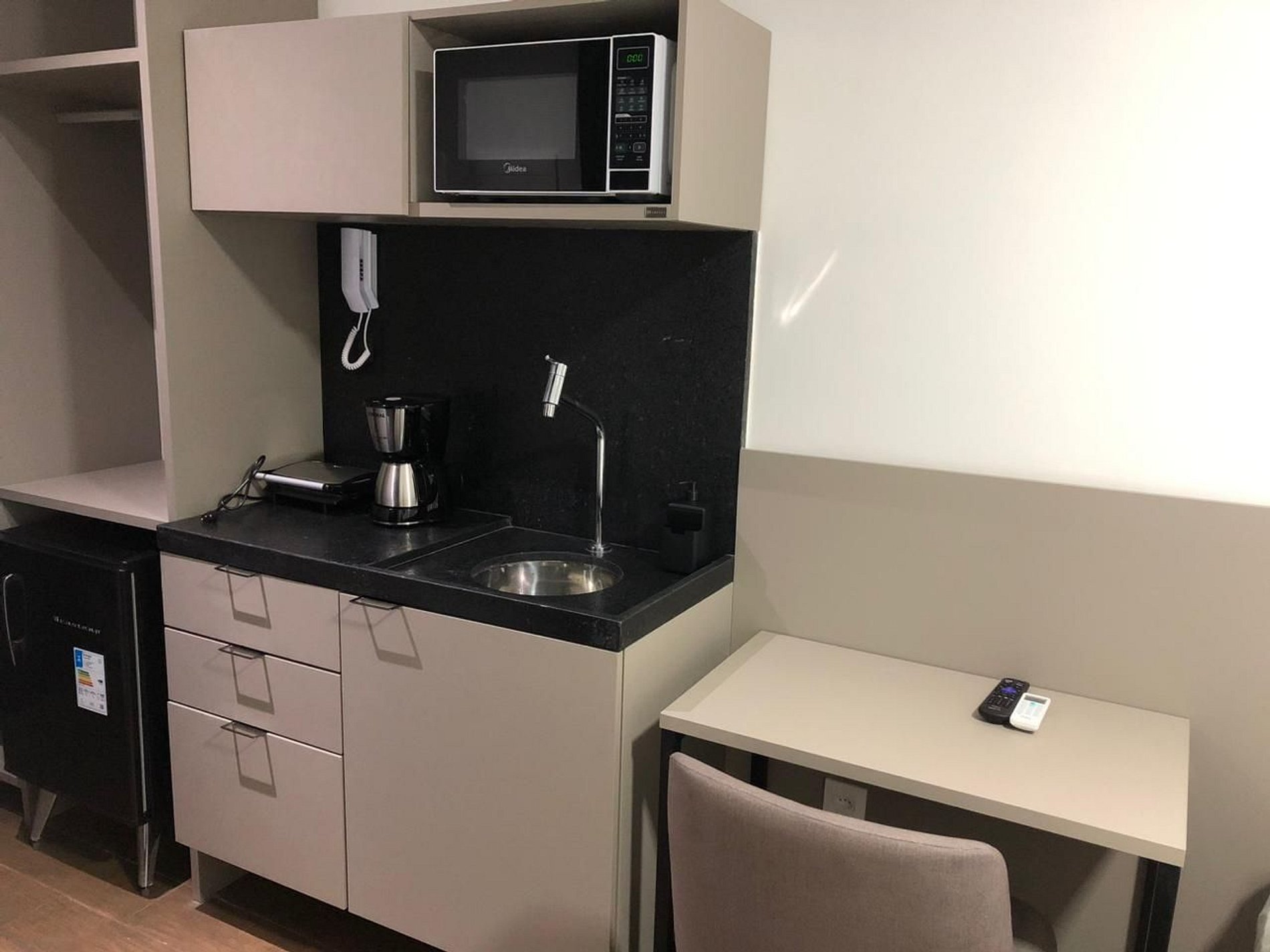 A cozinha compacta inclui frigobar, micro-ondas, sanduicheira e cafeteira.