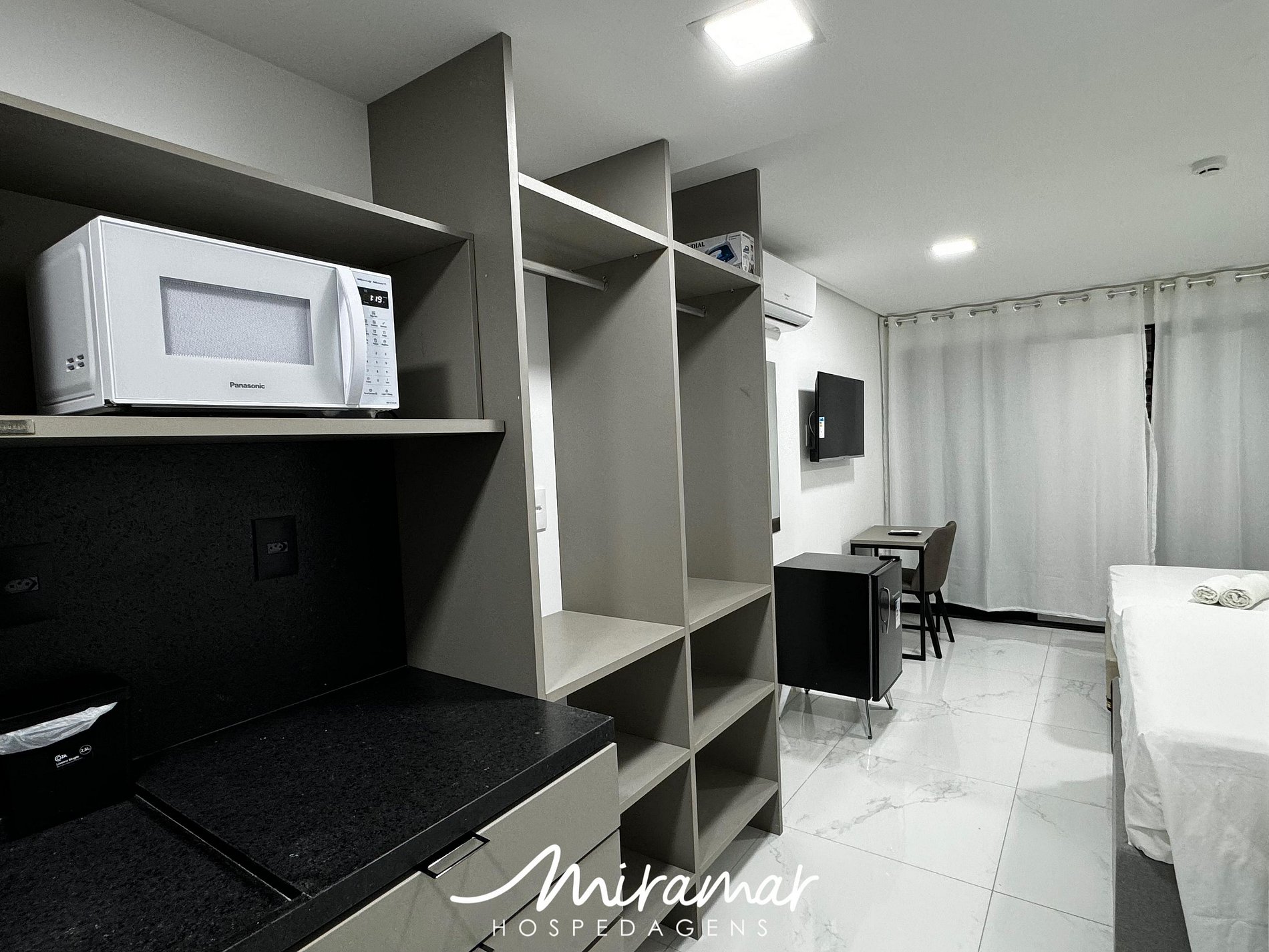 A cozinha compacta inclui frigobar, micro-ondas, cafeteira e sanduicheira.