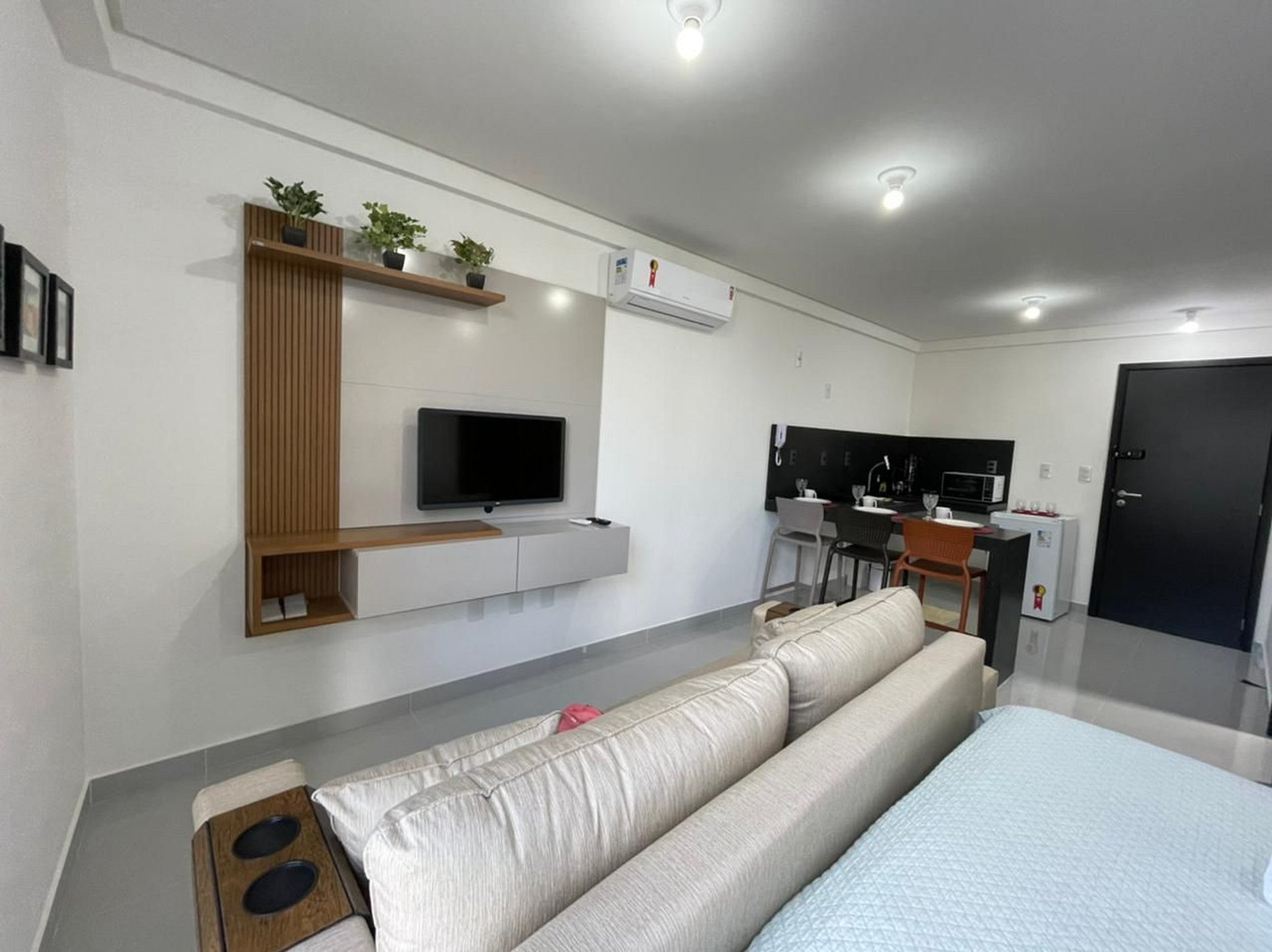 O ambiente é climatizado com ar-condicionado, garantindo o seu conforto e e uma brisa fresca. O sofá, é convidativo, para momentos de entretenimento na Tv.