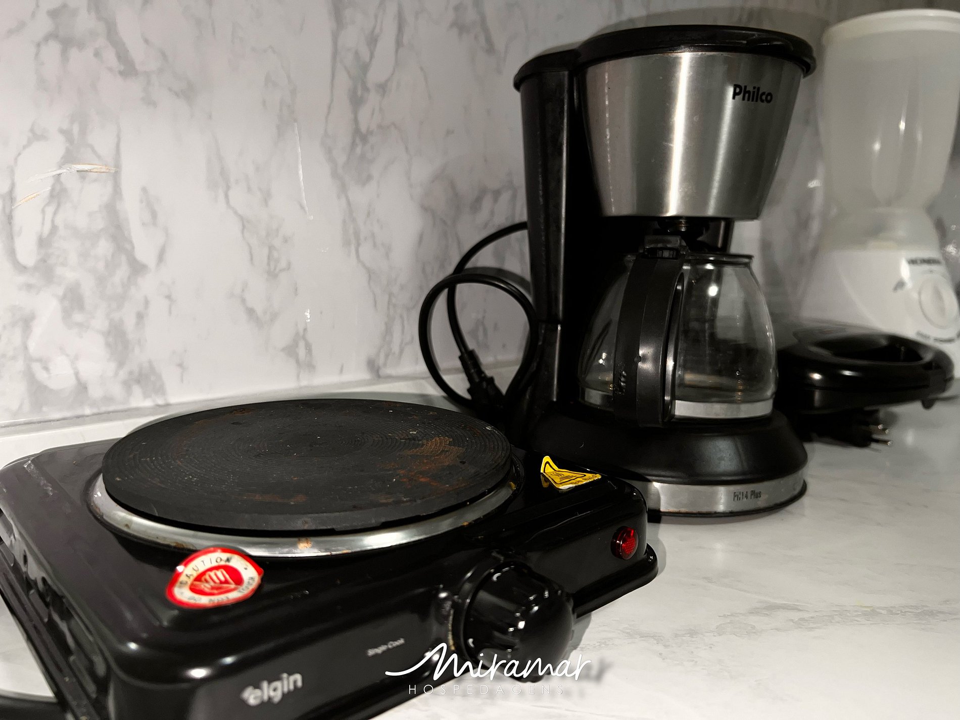 Na sala, você encontra um sofá-cama, televisão e uma bancada de vidro com duas cadeiras, perfeita para refeições rápidas ou para utilizar o notebook. A cozinha americana é completa, equipada com armário, fogão de uma boca, micro-ondas, frigobar, cafeteira, sanduicheira e liquidificador, além de louças, talheres e panelas tudo o que você precisa para preparar suas refeições rápidas com praticidade. O quarto é um convite ao descanso: cama grande e confortável, travesseiros, televisão e guarda-roupa para organizar seus pertences. O ambiente é climatizado com ar-condicionado, garantindo noites de sono tranquilas e revigorantes.