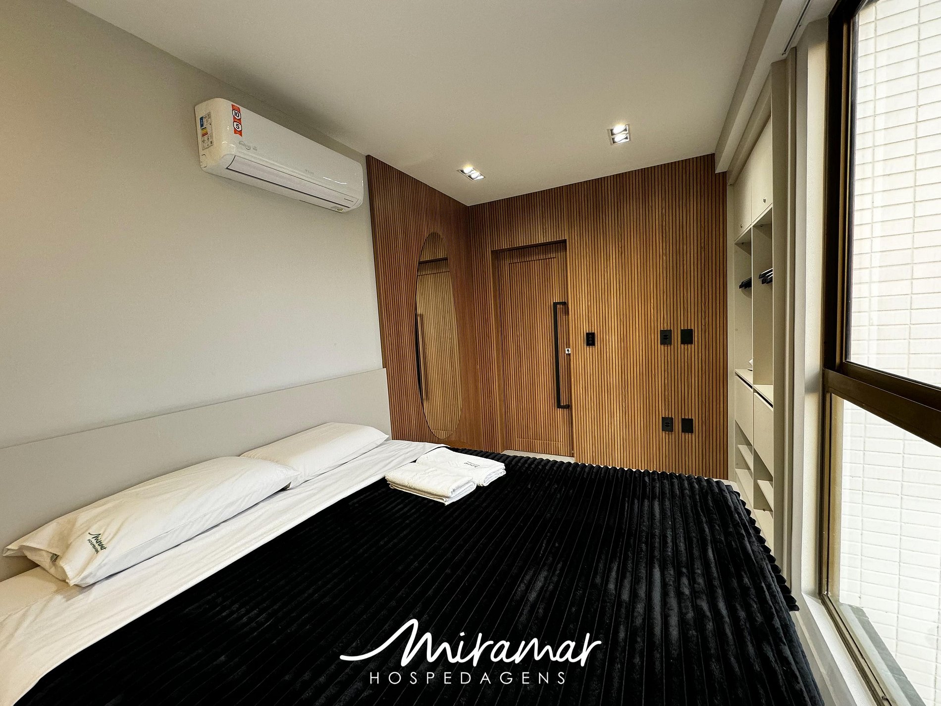 A suíte é um verdadeiro refúgio, com uma cama de casal confortável posicionada em frente a uma janela que oferece uma vista deslumbrante da cidade. O banheiro, com seu design clean, proporciona um toque de elegância e conforto.