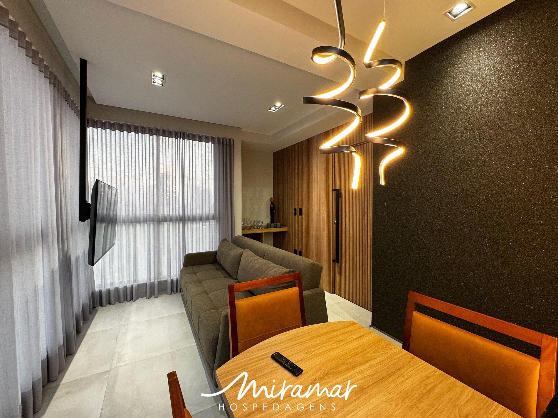 Na sala de estar, a decoração aconchegante complementa o sofá confortável e a Smart TV, criando o ambiente ideal para relaxar após um dia cheio de atividades.