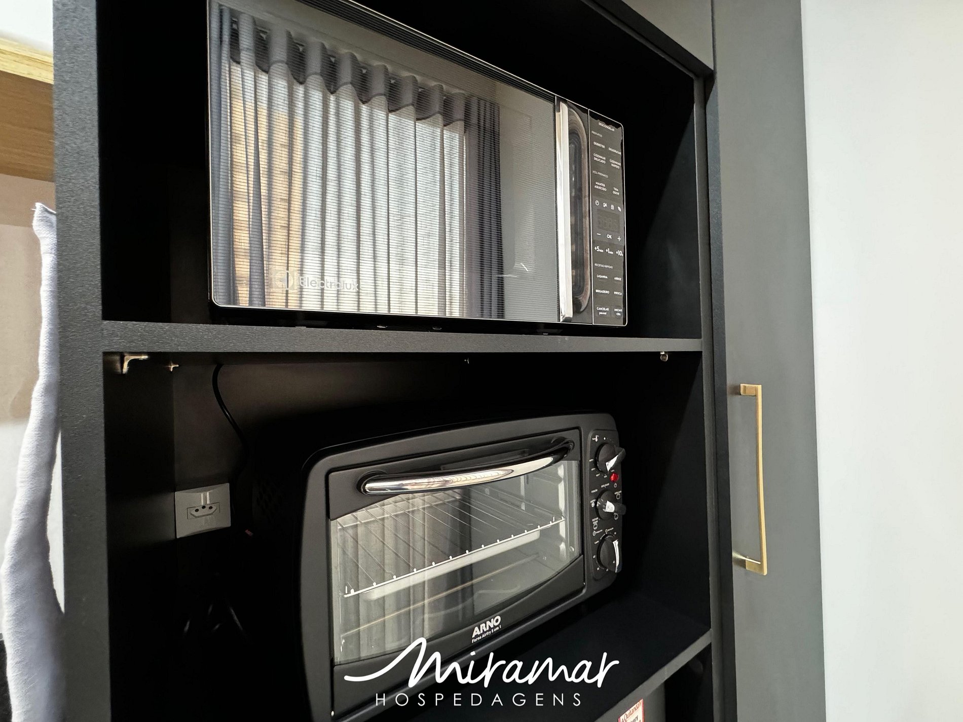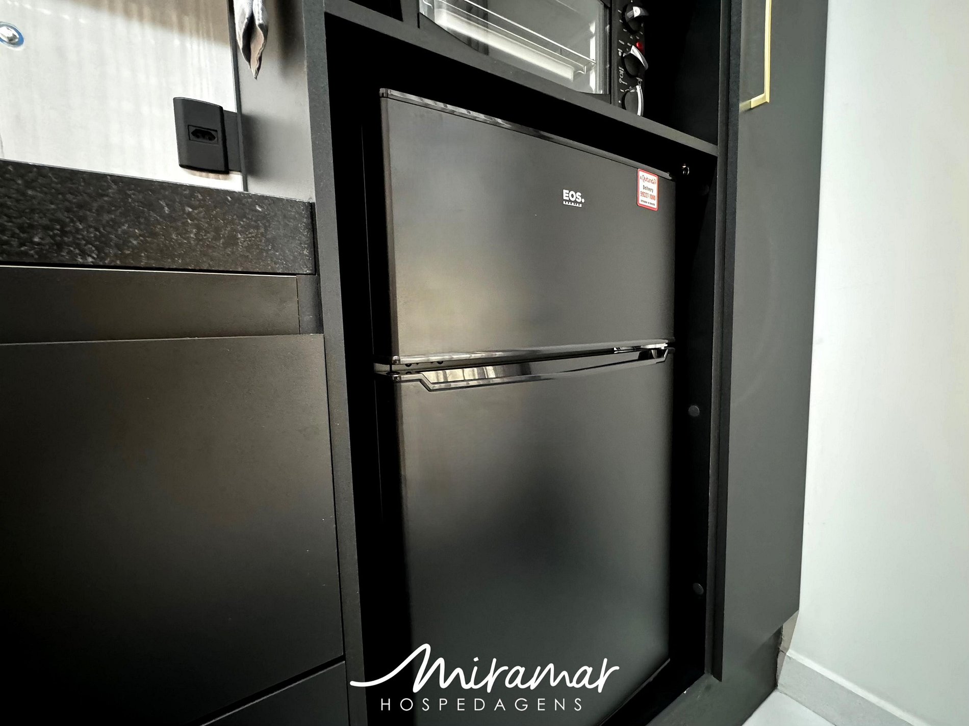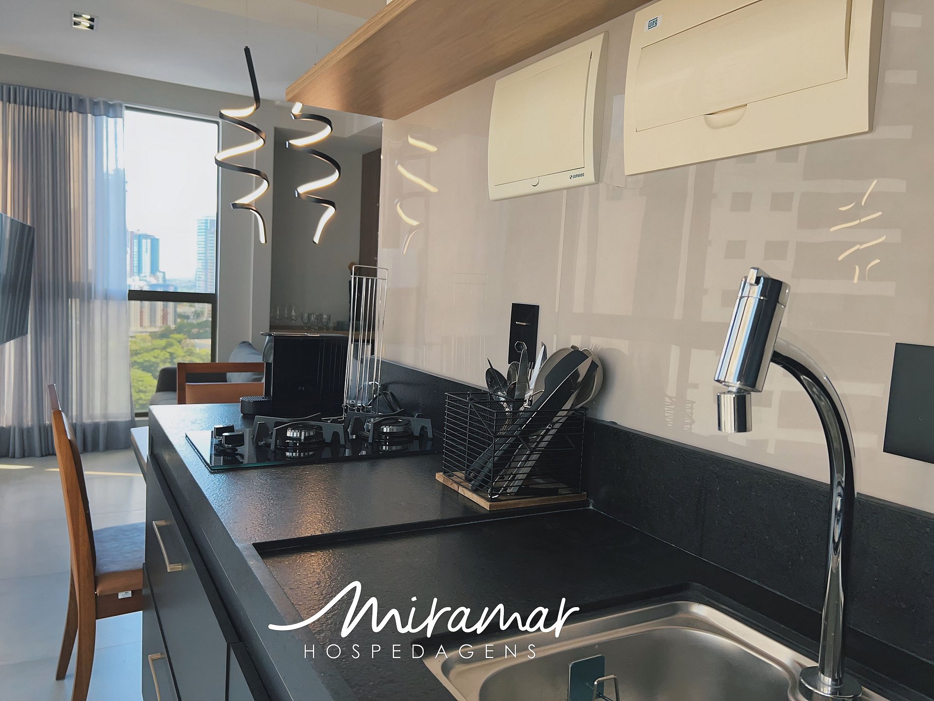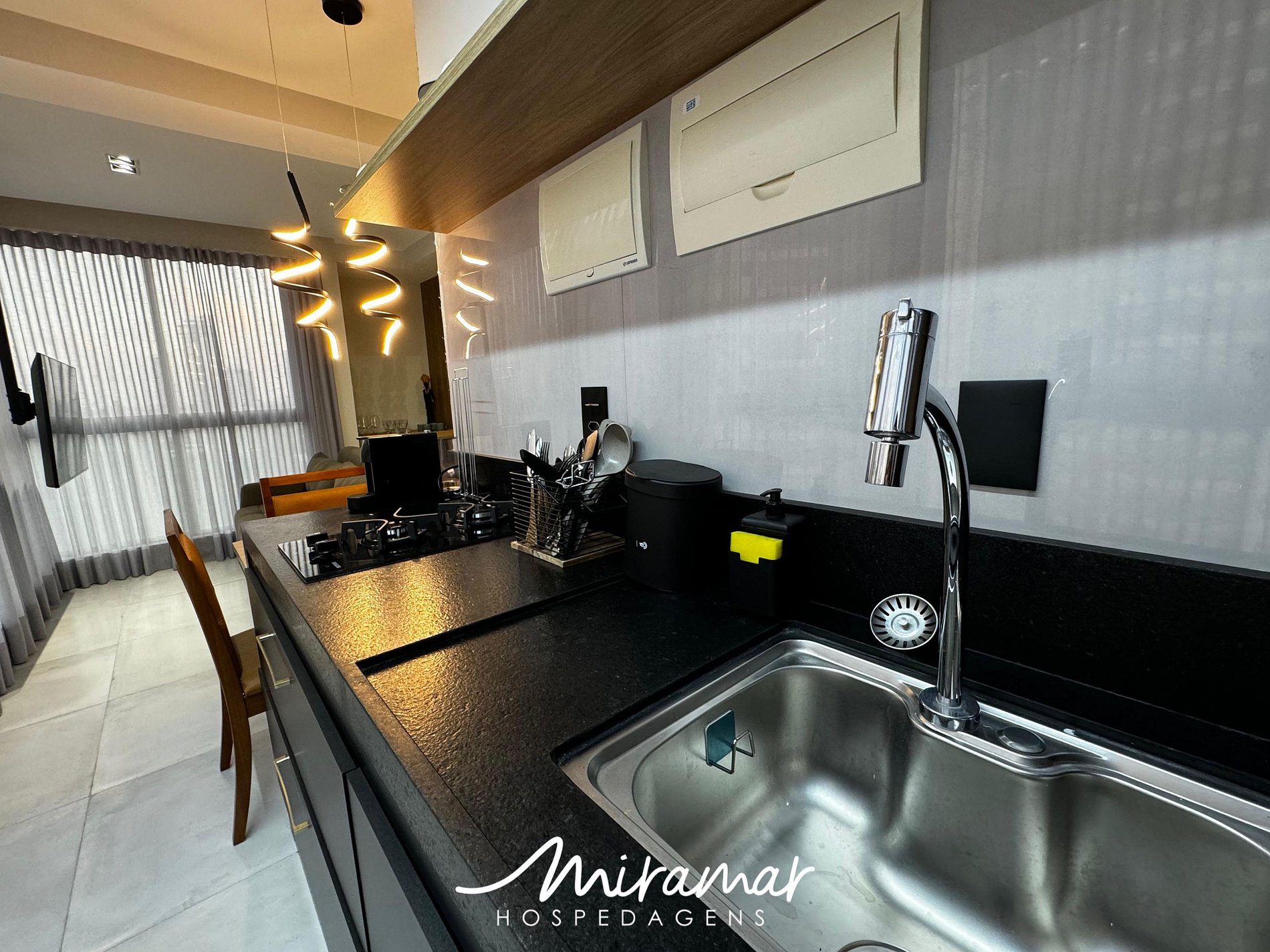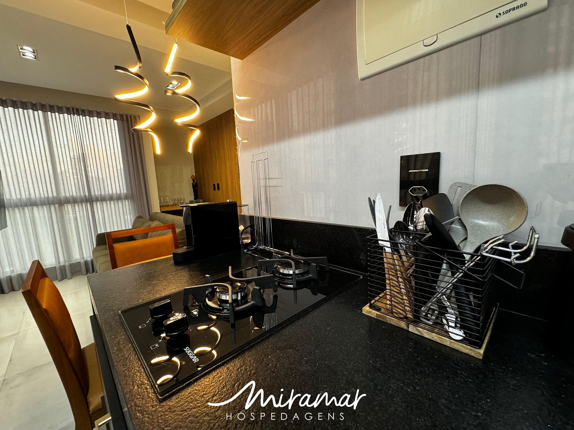 A cozinha compacta é perfeita para quem gosta de preparar refeições práticas e saborosas, equipada com frigobar, fogão, micro-ondas e sanduicheira, tornando o seu dia a dia mais fácil.