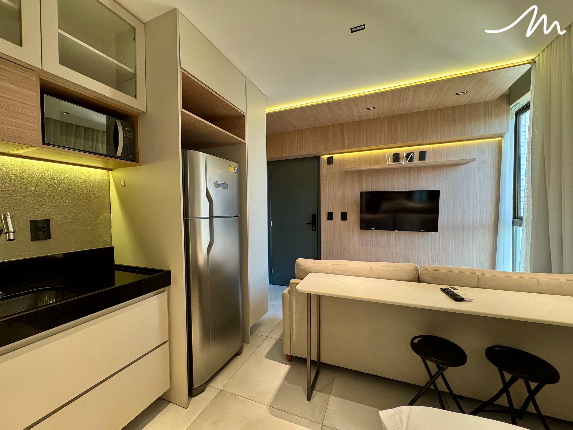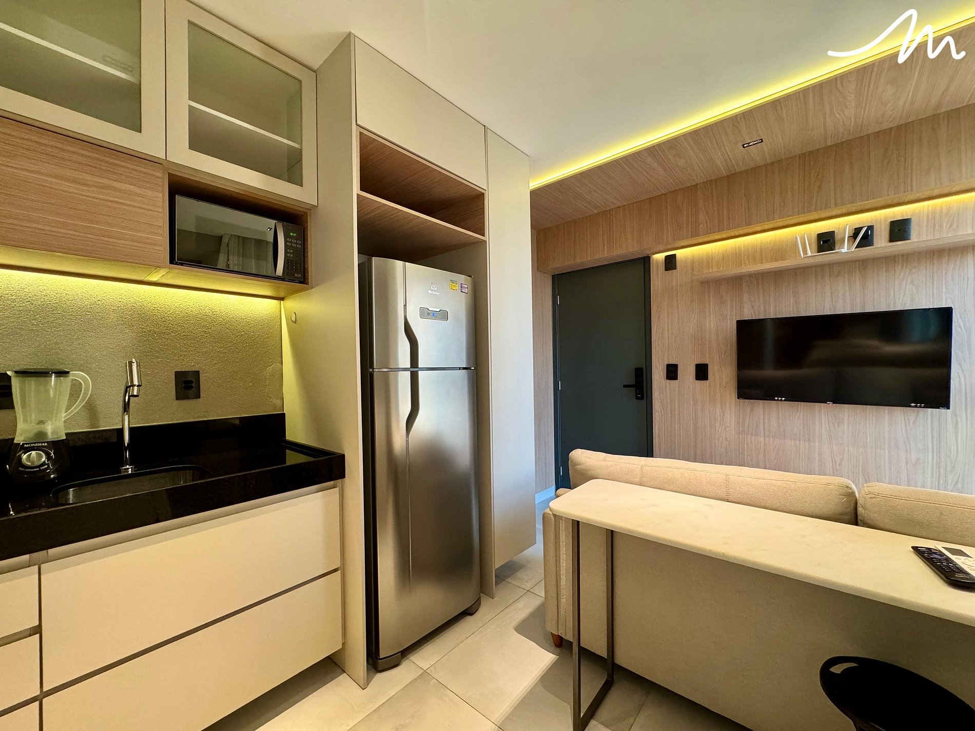 A cozinha foi planejada para oferecer tudo o que você precisa durante a sua estadia. Está equipada com micro-ondas, liquidificador, cafeteira, sanduicheira, geladeira, fogão de indução, além de louças e talheres. Assim, você pode preparar desde um café da manhã rápido até refeições completas com praticidade.