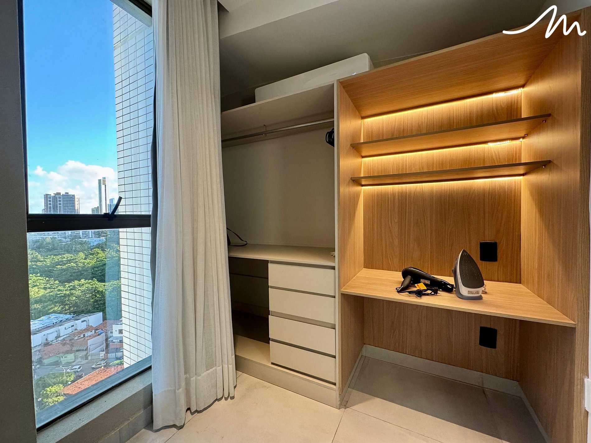 O ambiente também conta com uma charmosa bancada acompanhada de dois bancos, ideal tanto para realizar refeições quanto para utilizar o computador com comodidade. Para seu bem-estar, o espaço é climatizado com ar-condicionado, e para facilitar sua estadia, disponibilizamos secador de cabelo, ferro de passar, cabides, além de uma arara com gavetas para organizar seus pertences.