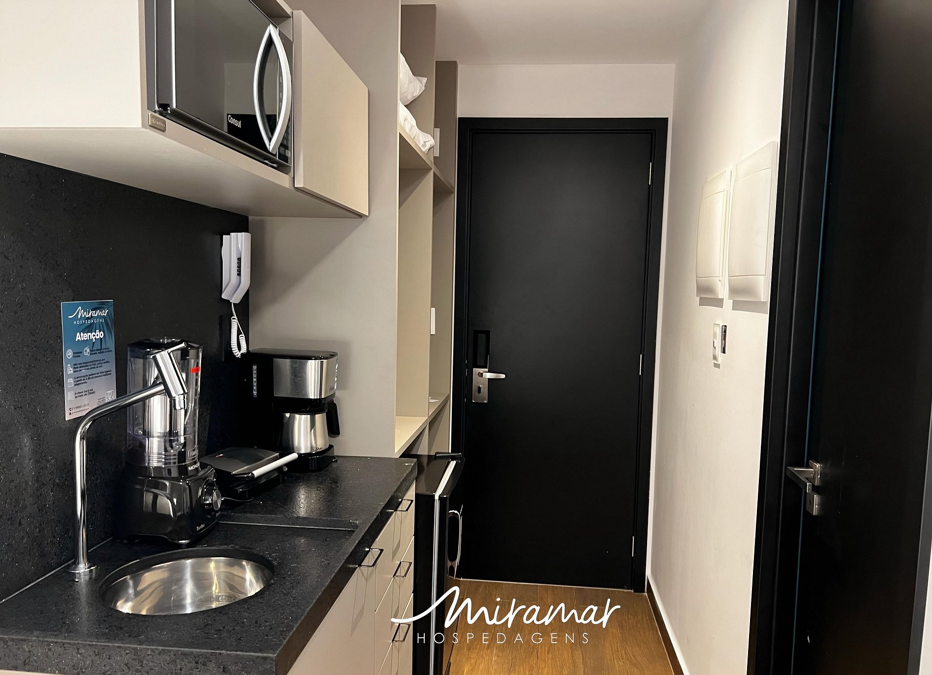 Na cozinha compacta, você encontrará os eletrodomésticos necessários para preparar refeições práticas, como frigobar, micro-ondas, liquidificador e sanduicheira.