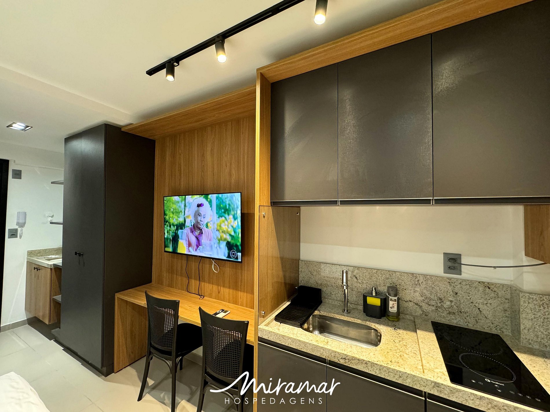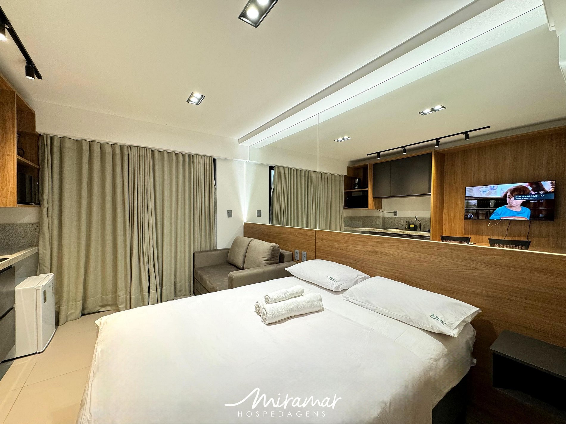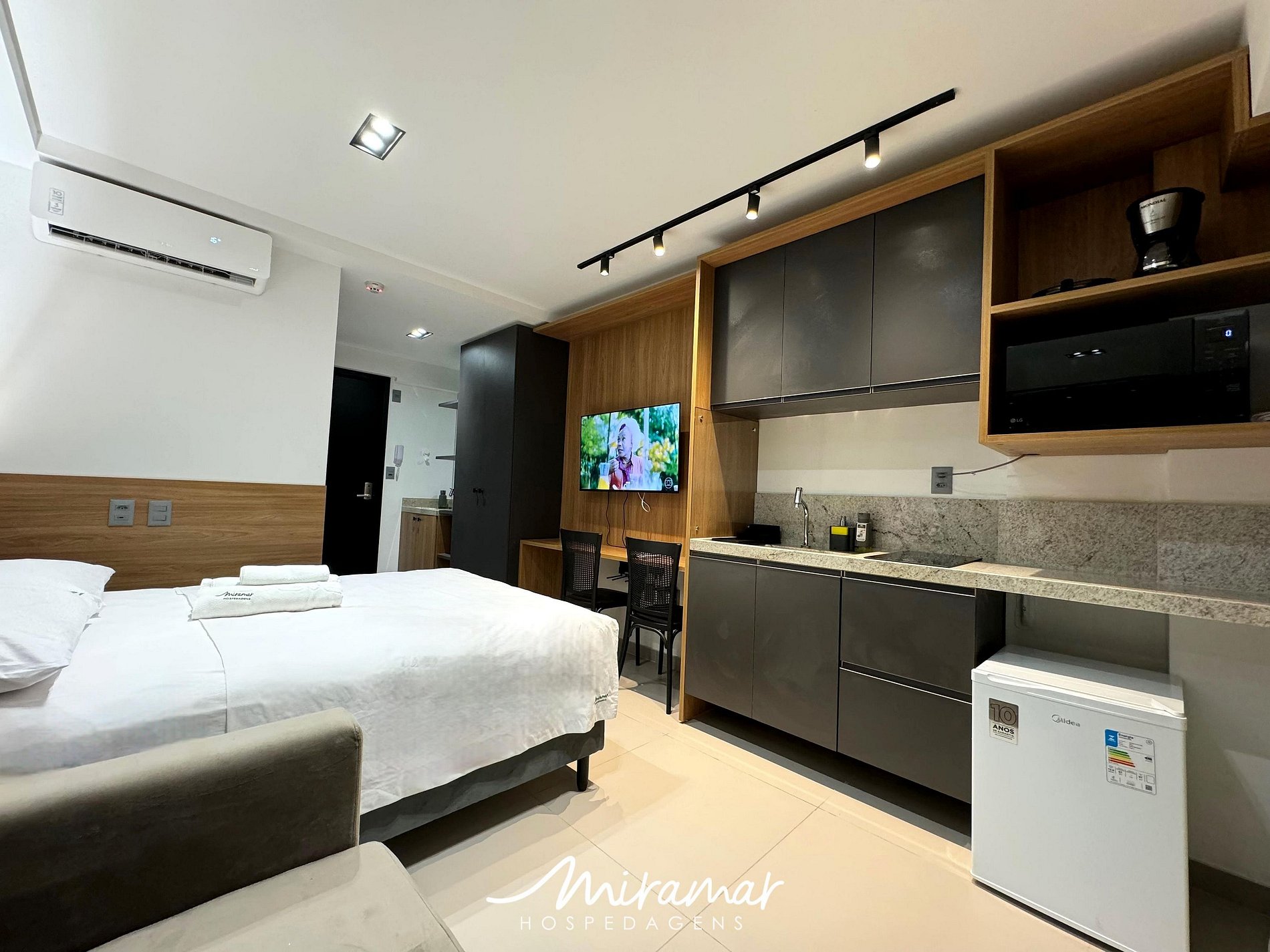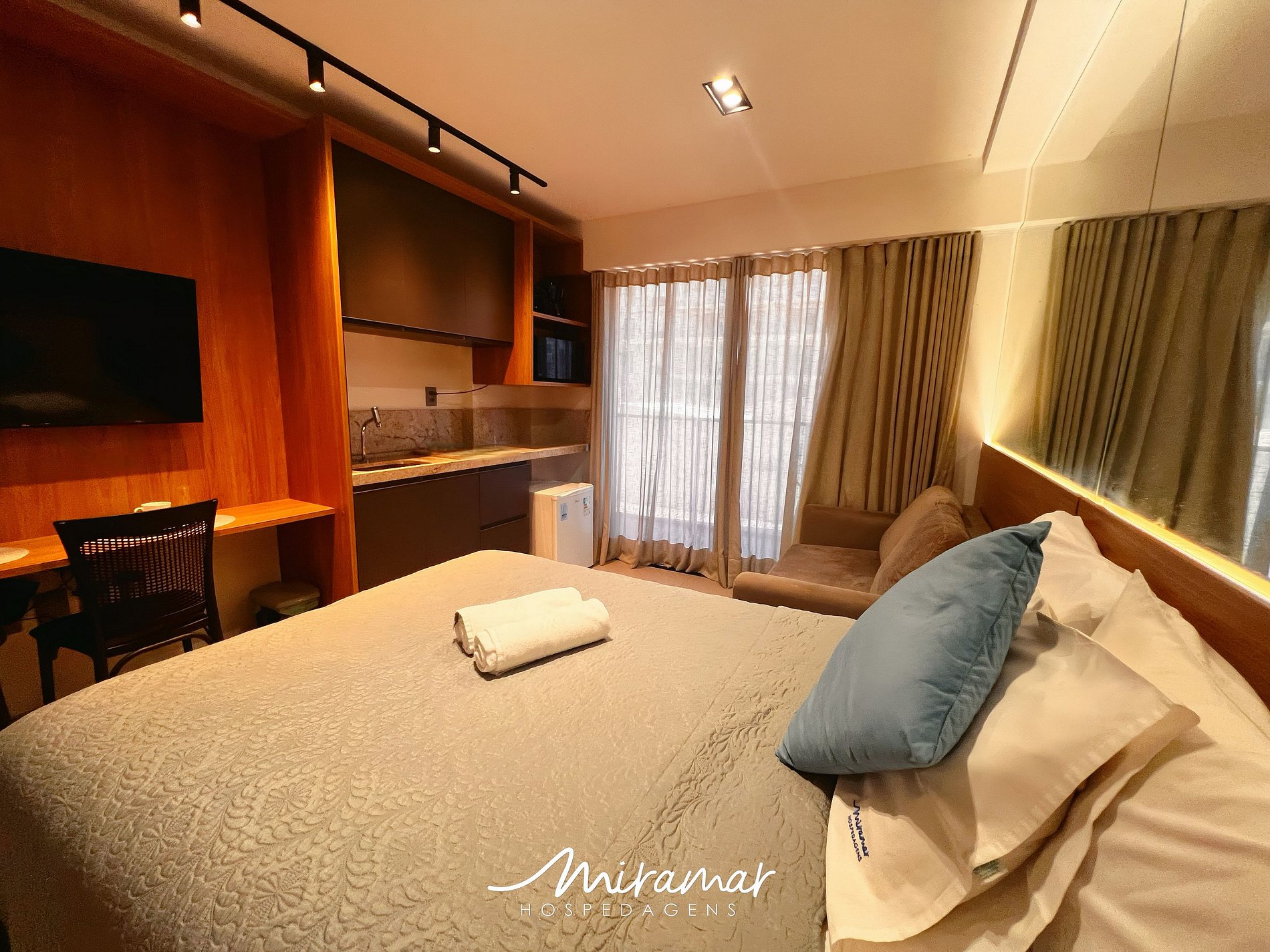 Com uma cama de casal e um sofá-cama, o espaço acomoda até 4 hóspedes com muito conforto. A iluminação suave cria um ambiente acolhedor e agradável, ideal para relaxar. A cozinha, embora compacta, está equipada com os itens essenciais para preparar refeições rápidas e práticas, incluindo frigobar, sanduicheira, cafeteira e micro-ondas, tudo à sua disposição. Pensamos nos detalhes para oferecer o máximo de conforto, por isso, você encontrará um secador de cabelo e ferro de passar para sua comodidade. Para momentos de lazer, contamos com Wi-Fi e TV, para você curtir seus filmes e programas favoritos com todo o conforto.