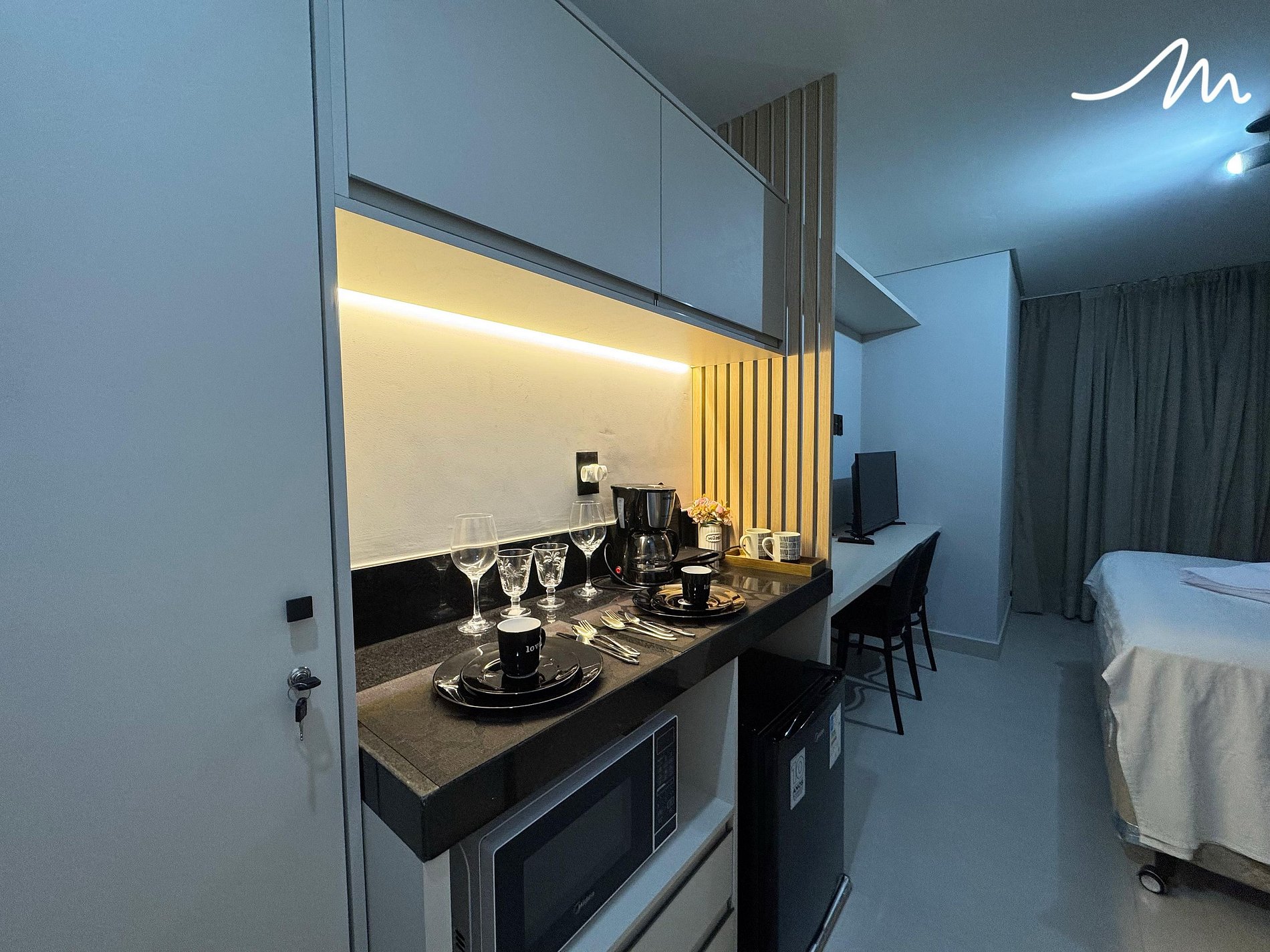 Ambiente climatizado com ar-condicionado, TV para seus momentos de lazer e uma cozinha compacta equipada com armário, micro-ondas, cafeteira de cápsula (as cápsulas não estão incluídas), liquidificador, sanduicheira, fogão elétrico de duas bocas, frigobar, louças, copos e talheres. Também disponibilizamos um varal para sua comodidade.
