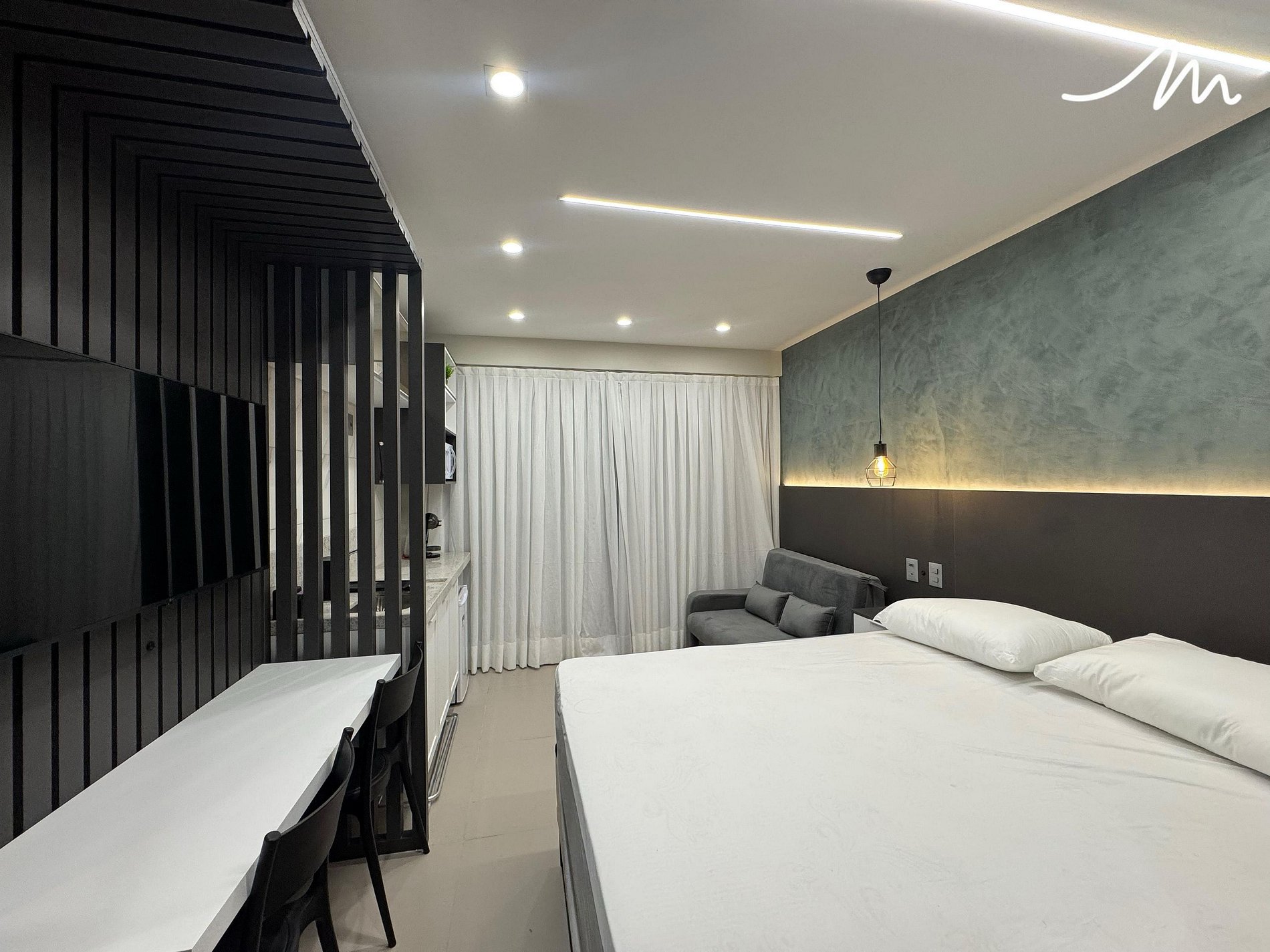 Hospede-se neste flat encantador, pensado com carinho para te oferecer conforto e praticidade. O espaço conta com cama de casal, sofá e travesseiros conforme a quantidade de hóspedes. A bancada com duas cadeiras é ideal para refeições rápidas ou para usar o computador com conforto.