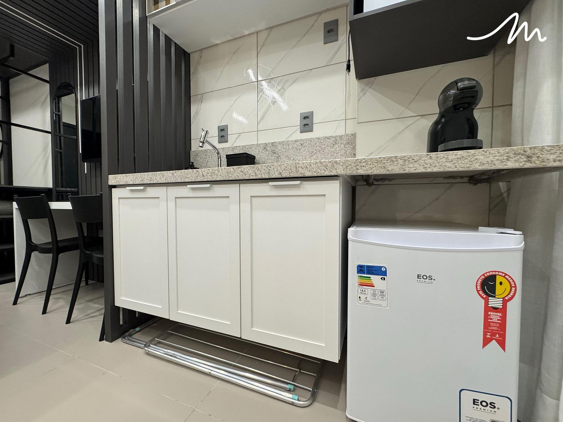 Ambiente climatizado com ar-condicionado, TV para seus momentos de lazer e uma cozinha compacta equipada com armário, micro-ondas, cafeteira de cápsula (as cápsulas não estão incluídas), liquidificador, sanduicheira, fogão elétrico de duas bocas, frigobar, louças, copos e talheres. Também disponibilizamos um varal para sua comodidade.