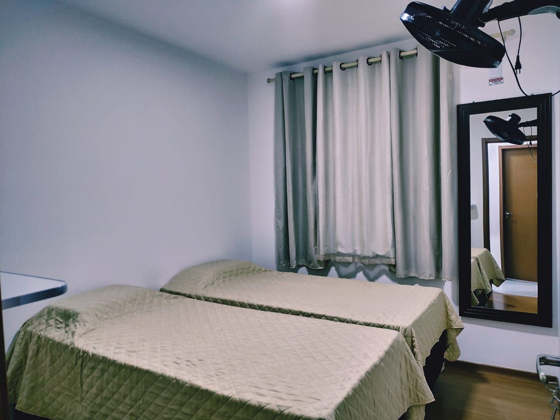 O apartamento possui dois quartos, sendo um quarto com cama de Casal e ar condicionado e o outro com duas camas de solteiro e com ventilador.