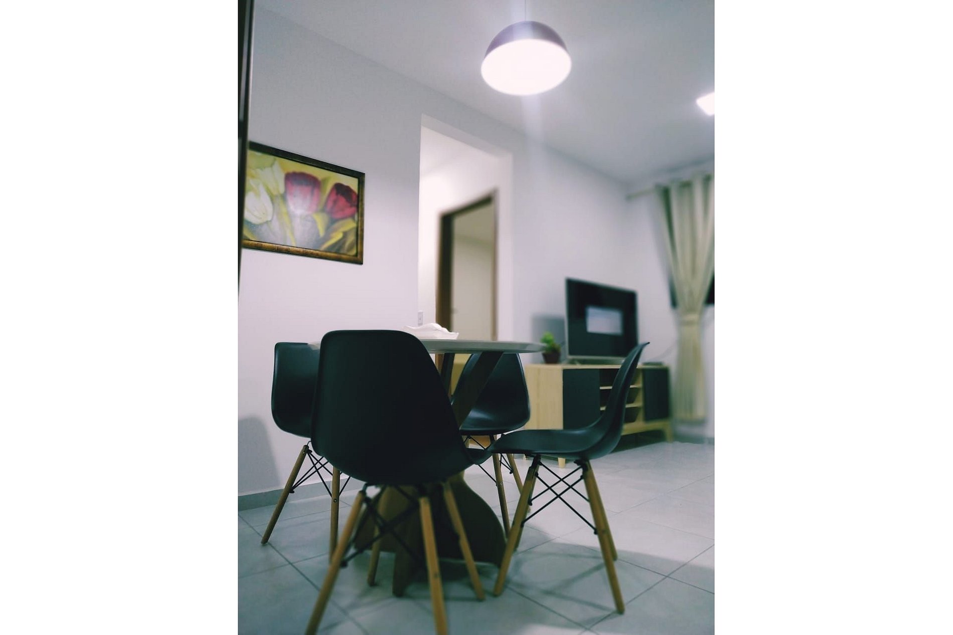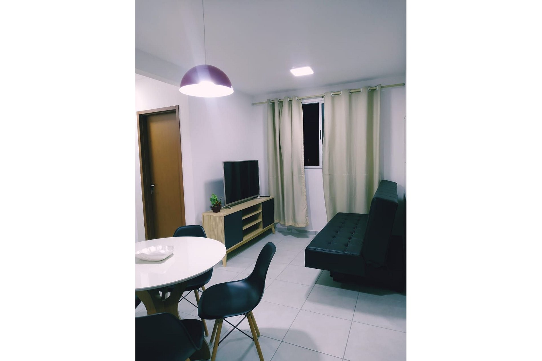 Sala com sofá retrátil, mesa com 04 cadeiras, Smart TV.