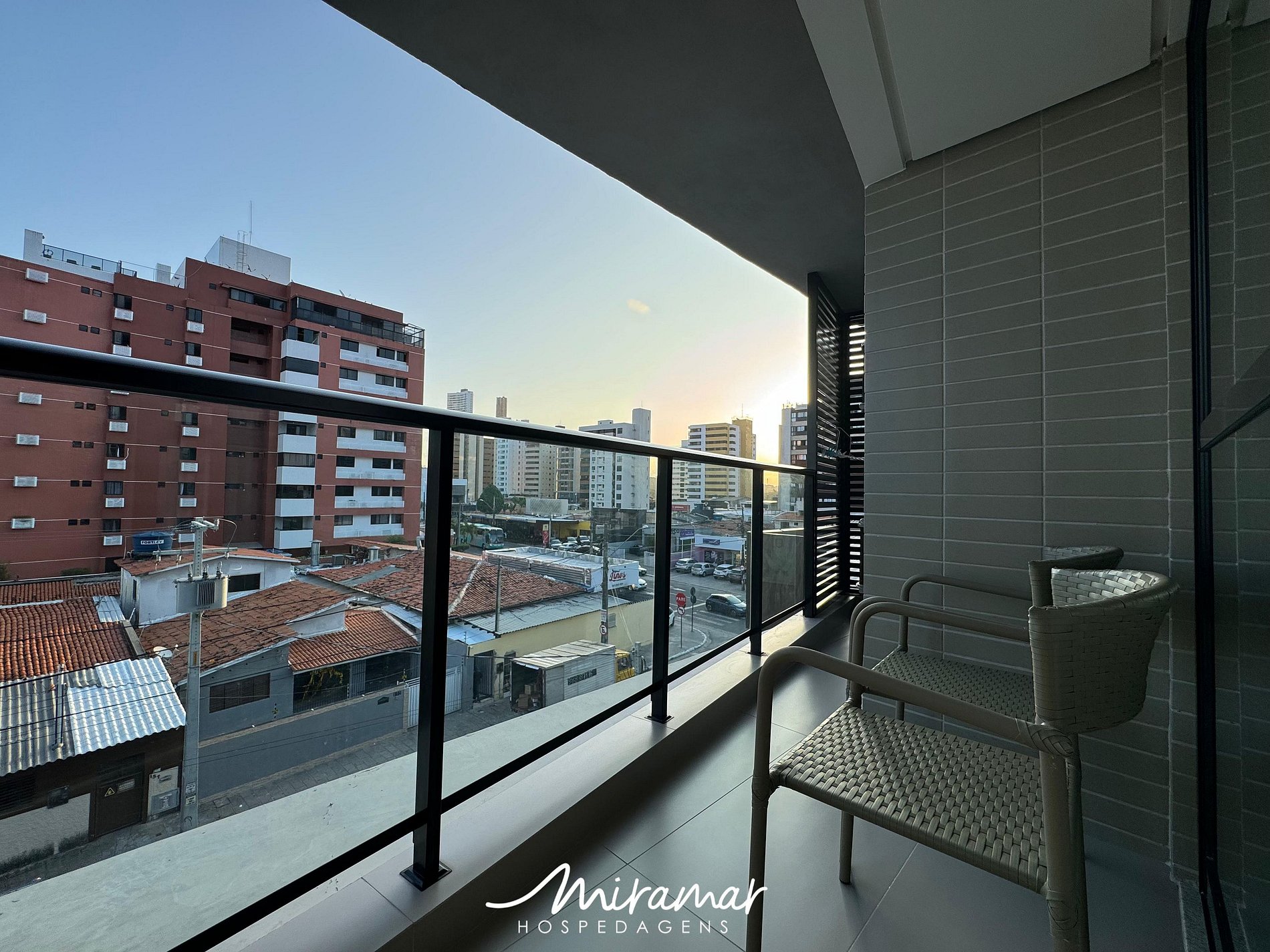 A varanda do apartamento é o local perfeito para momentos de tranquilidade. Ao olhar para ela, você será presenteado com uma vista da cidade e cadeiras para aproveitar a brisa, um cenário ideal para relaxar em qualquer hora do dia.