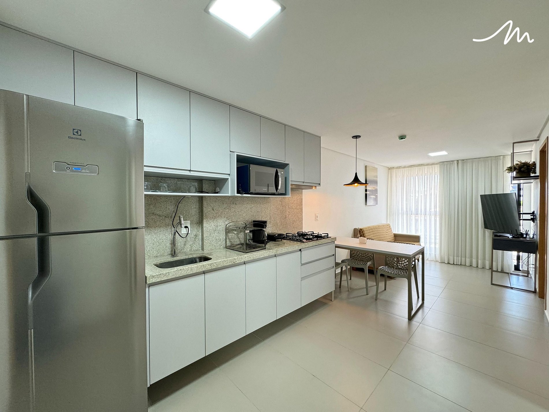 A sala de estar é o lugar ideal para relaxar, com um sofá confortável, smart TV e acesso à internet via wifi. Para momentos de refeição ou trabalho, há uma mesa com cadeiras, oferecendo conforto e funcionalidade. A cozinha compacta é equipada com todos os utensílios essenciais, como fogão, geladeira, micro-ondas, sanduicheira, liquidificador, louças e talheres, tornando a preparação de refeições simples e prática.