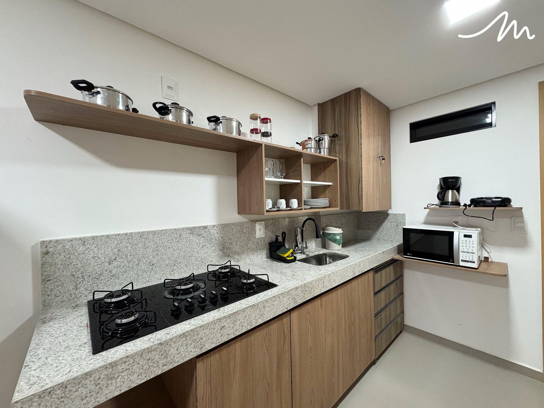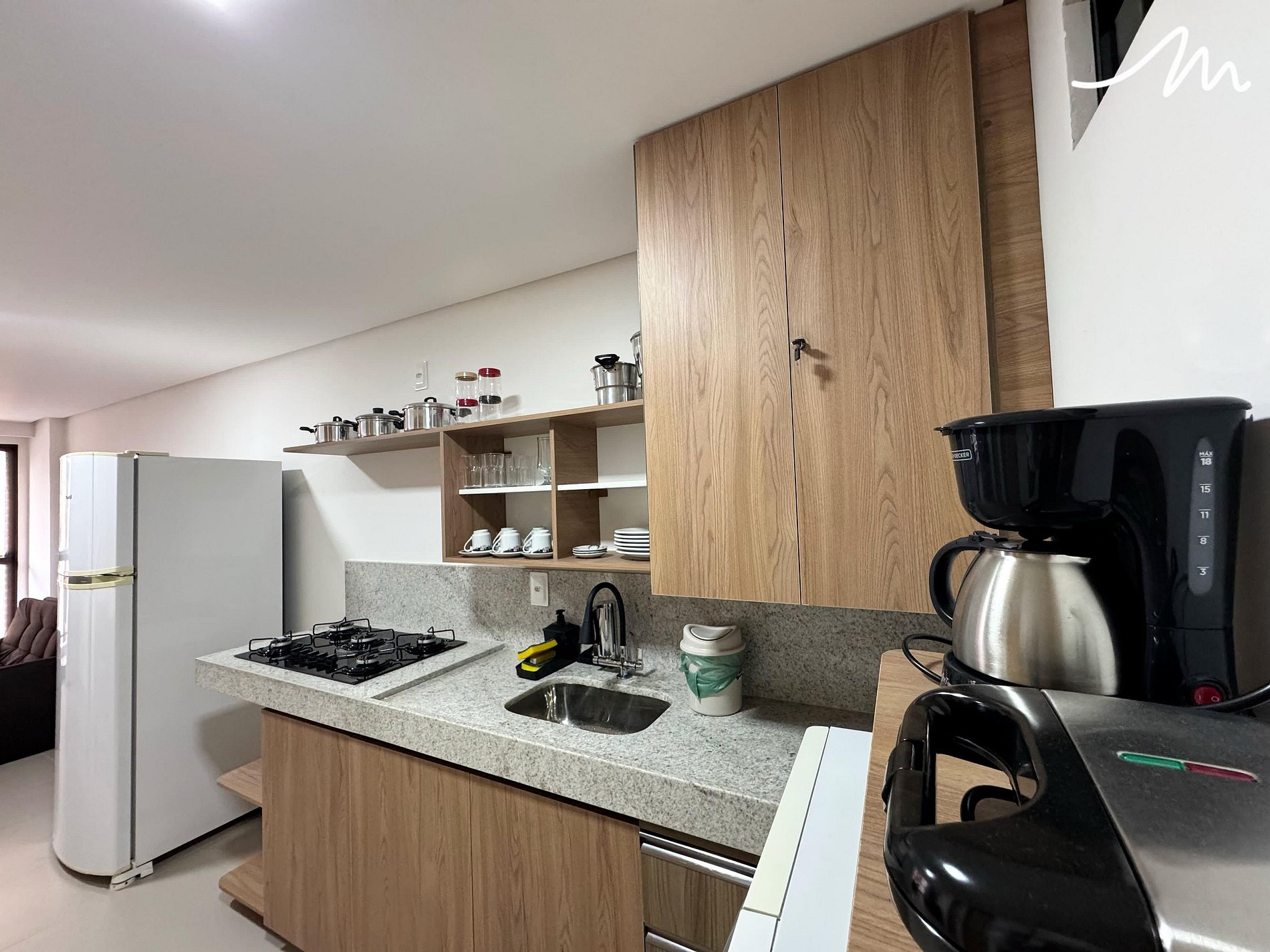 O imóvel acomoda até 5 pessoas com conforto e conta com uma sala de estar ampla e arejada, equipada com sofá-cama, TV e uma grande janela que proporciona ótima iluminação natural. A cozinha é funcional e bem equipada com fogão, micro-ondas, cafeteira, sanduicheira, além de louças, panelas e talheres — tudo que você precisa para preparar suas refeições com praticidade. A mesa com 4 cadeiras é ideal para momentos agradáveis em família ou entre amigos.