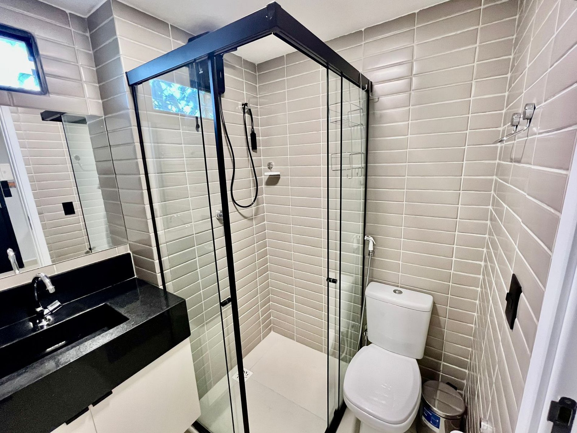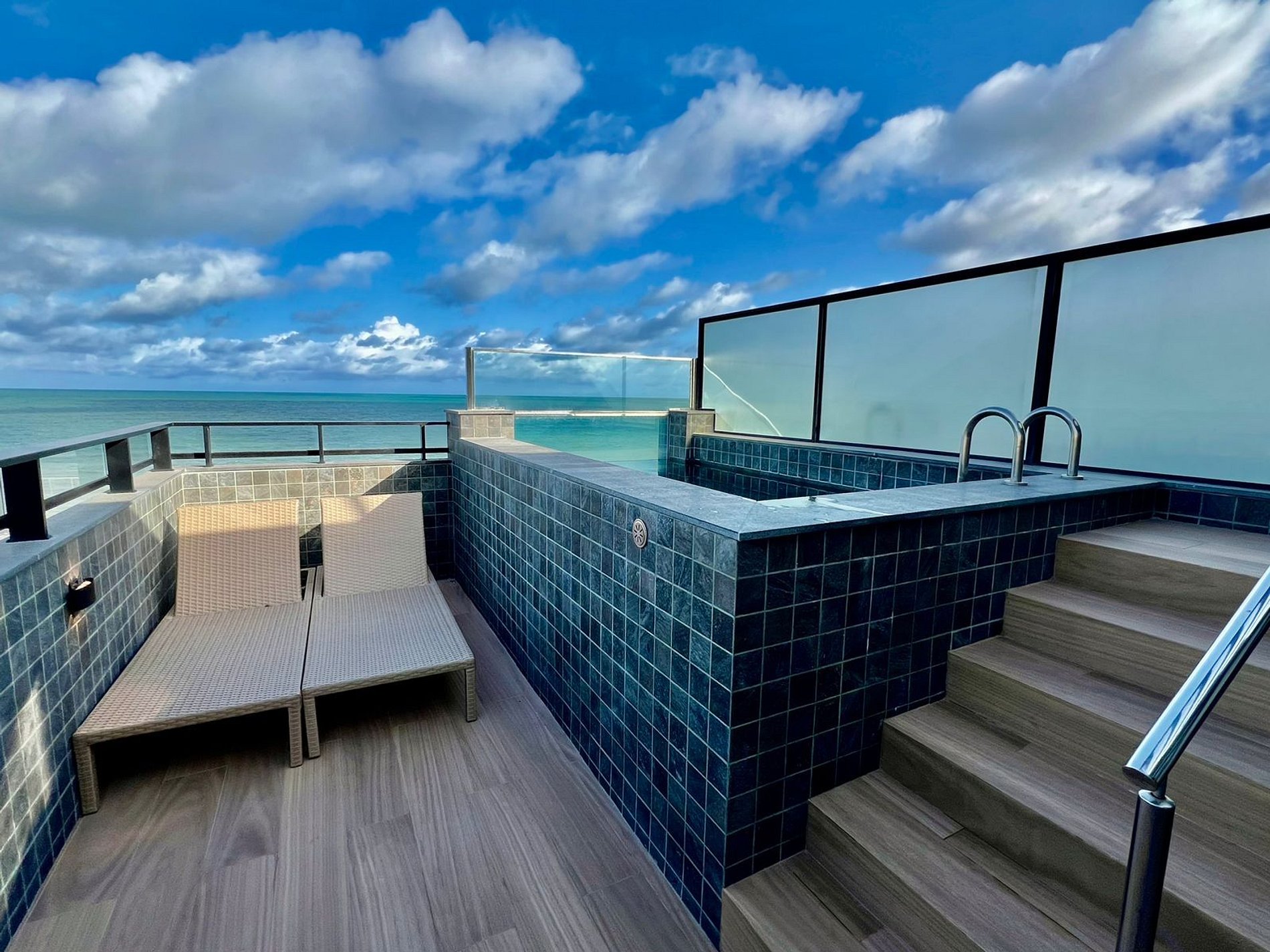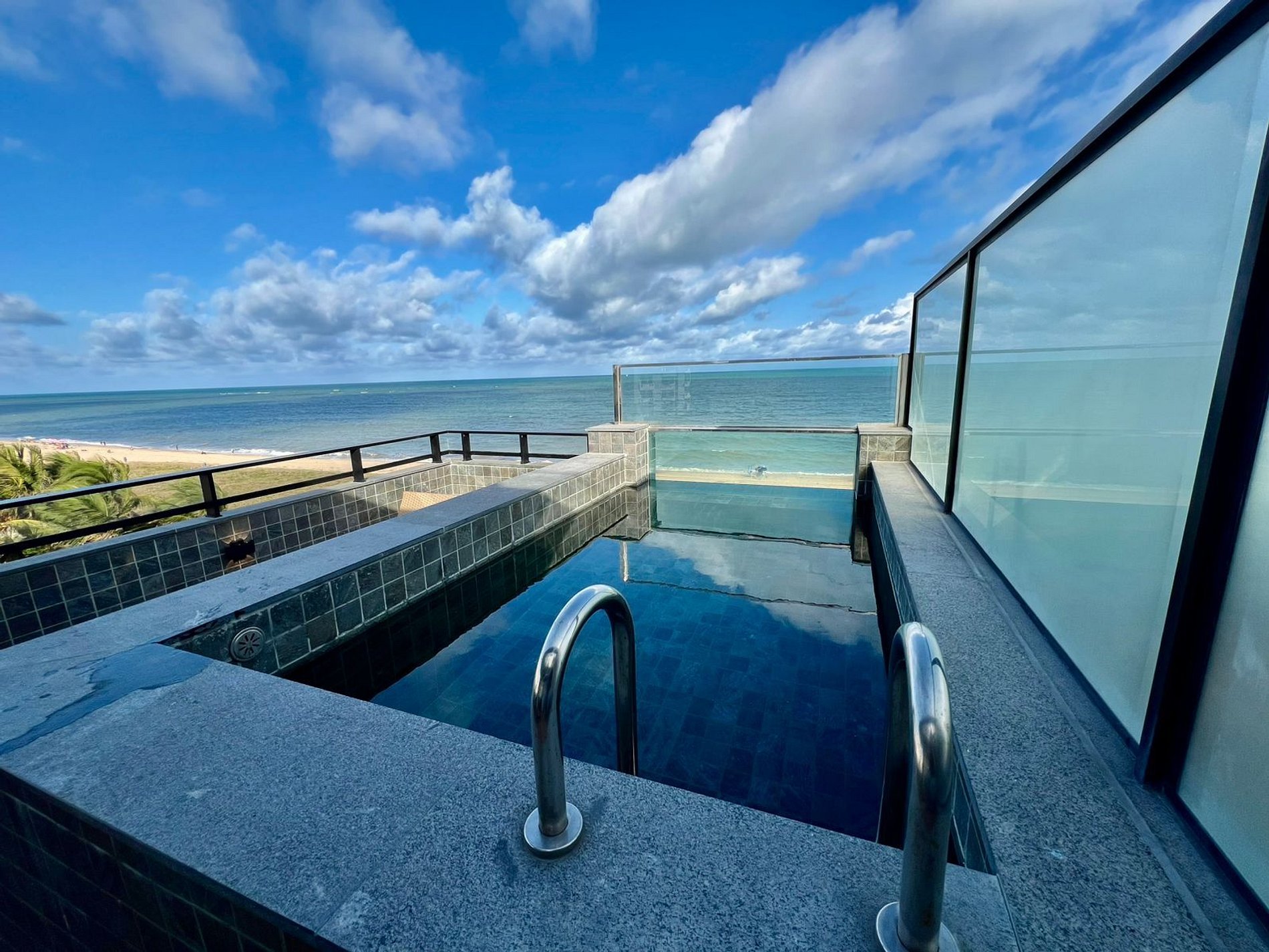 O flat dispõe de uma varanda com vista frente mar, equipada com piscina privativa para sua comodidade, além de mesa, cadeiras e espreguiçadeira, criando o ambiente perfeito para relaxar e aproveitar momentos inesquecíveis.