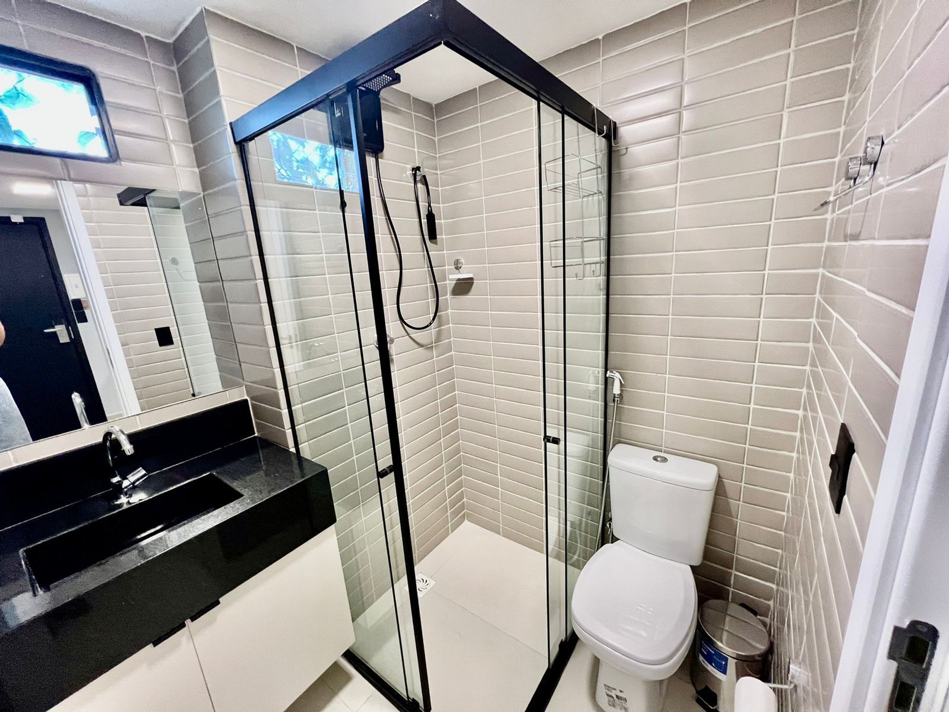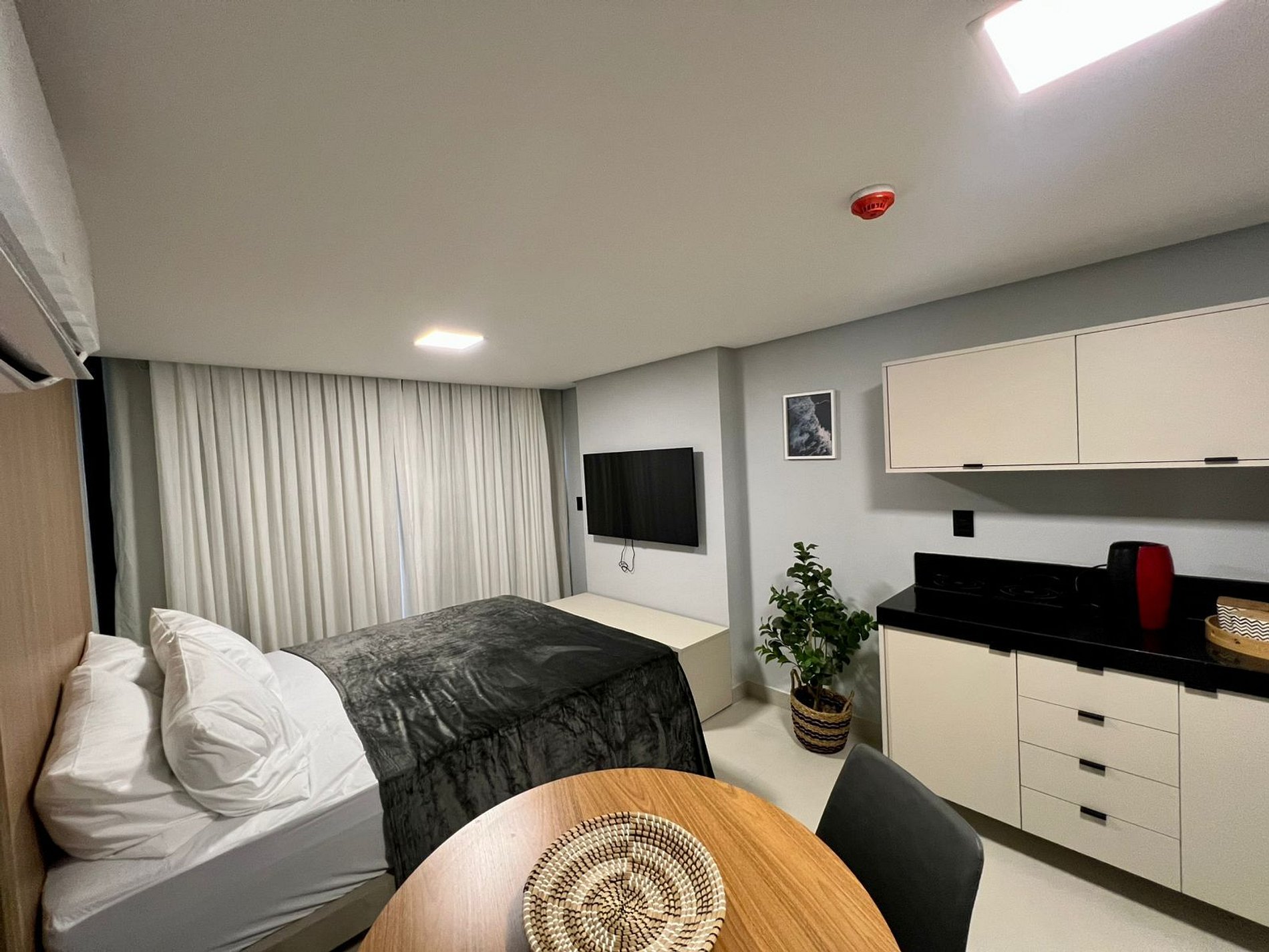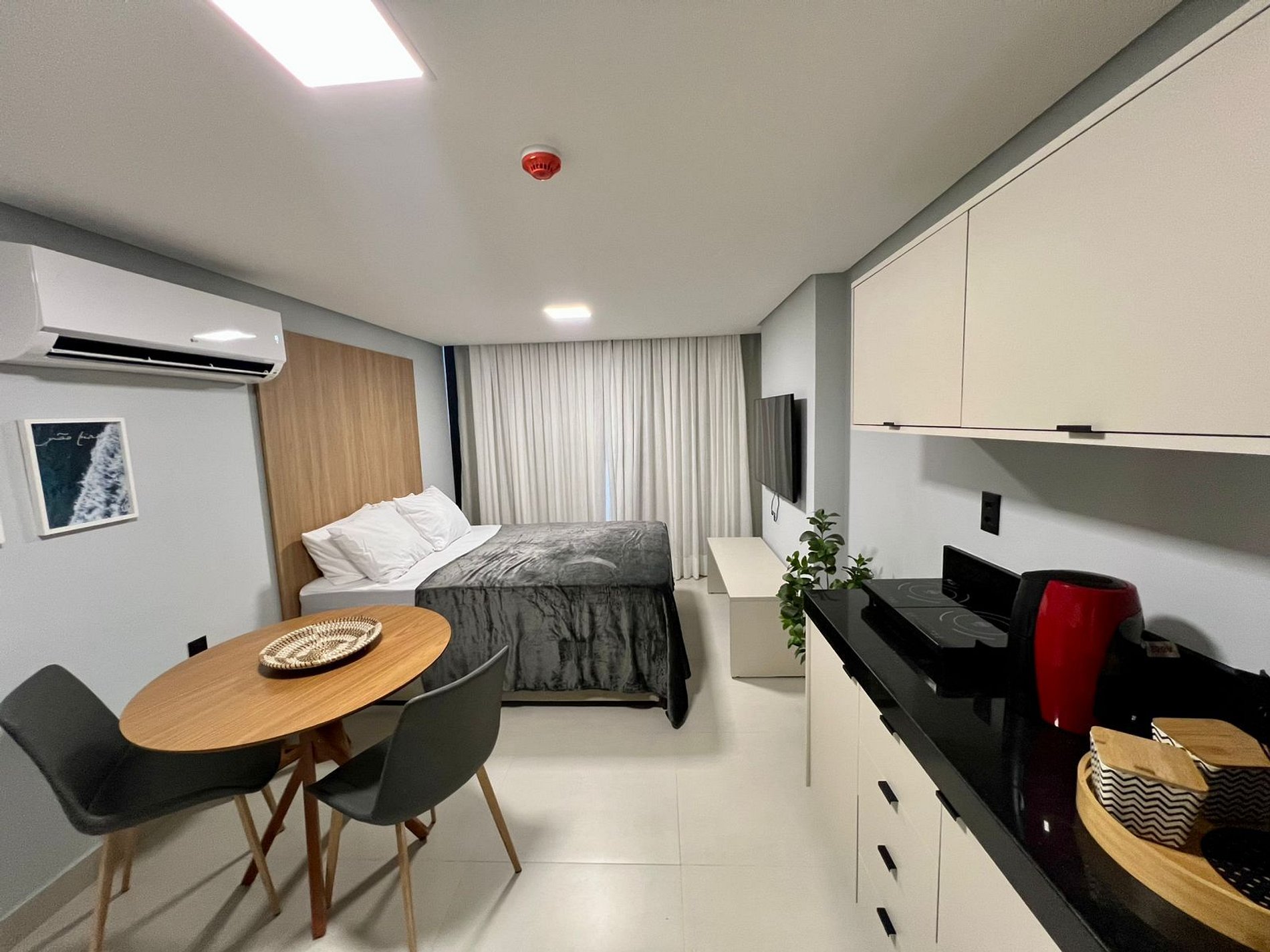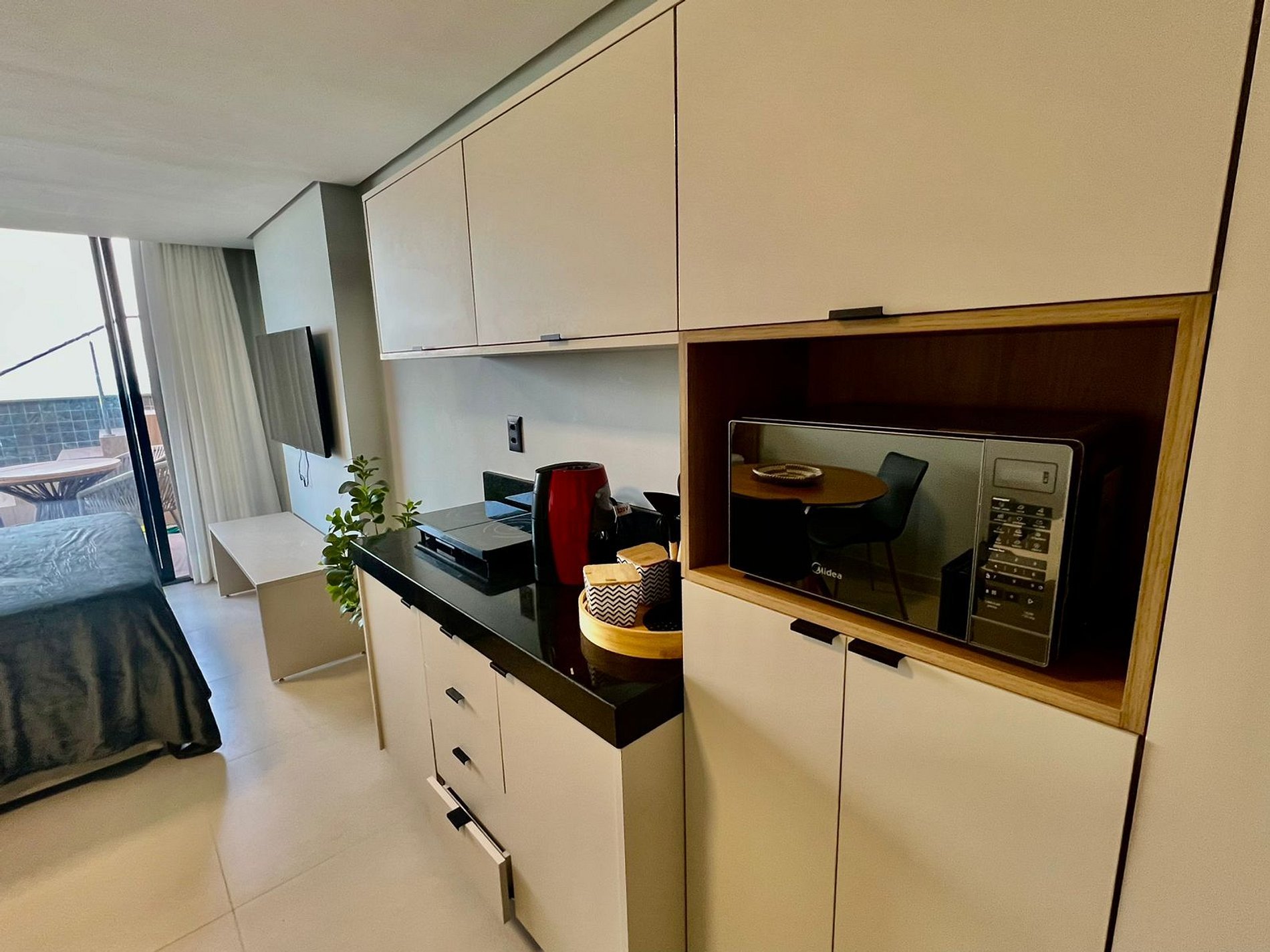 O flat dispõe de uma varanda com vista frente mar, equipada com piscina privativa para sua comodidade, além de mesa, cadeiras e espreguiçadeira, criando o ambiente perfeito para relaxar e aproveitar momentos inesquecíveis.