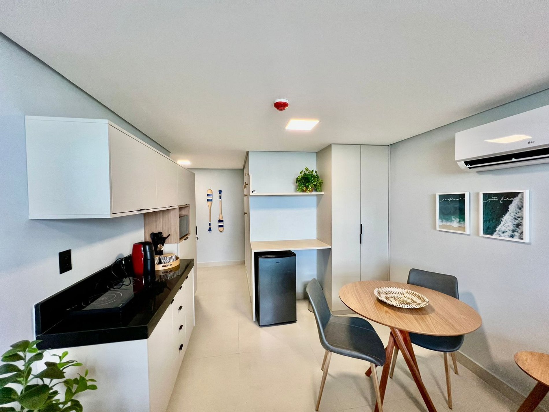 A cozinha compacta oferece tudo o que você precisa: frigobar, fogão elétrico, micro-ondas e cafeteira de cápsulas, facilitando o preparo de refeições rápidas e práticas. Além disso, disponibilizamos enxoval de cama, com lençóis e toalhas, e uma mesa com cadeira para que você possa preparar e desfrutar de suas refeições no conforto de sua acomodação.