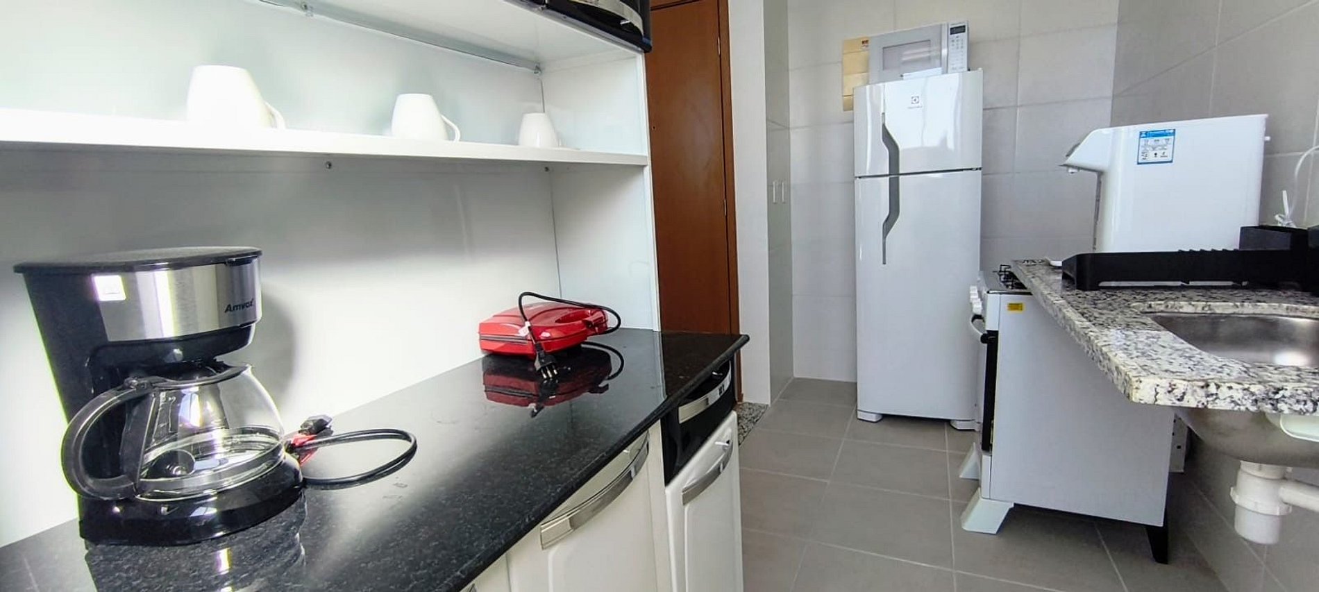 • Cozinha equipada com fogão, geladeira, sanduicheira, utensílios e filtro de água