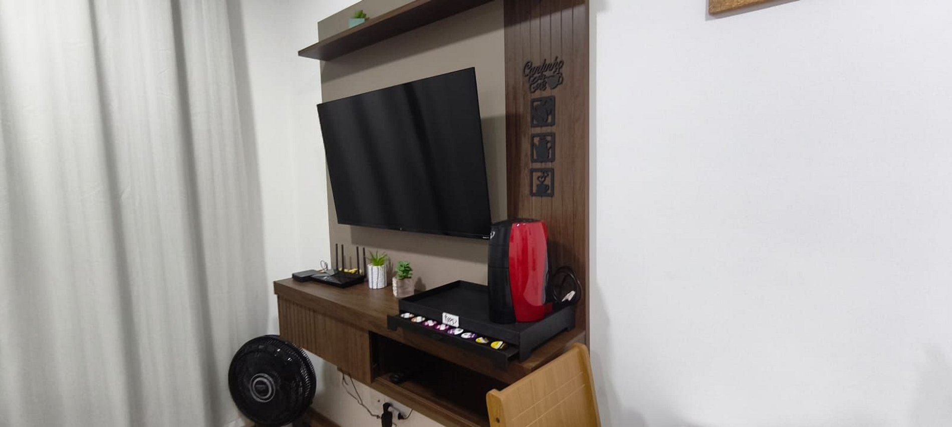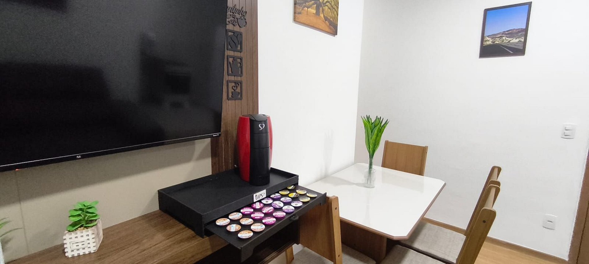 • Sala clara e aconchegante, com sofá, TV e mesa para refeições em família