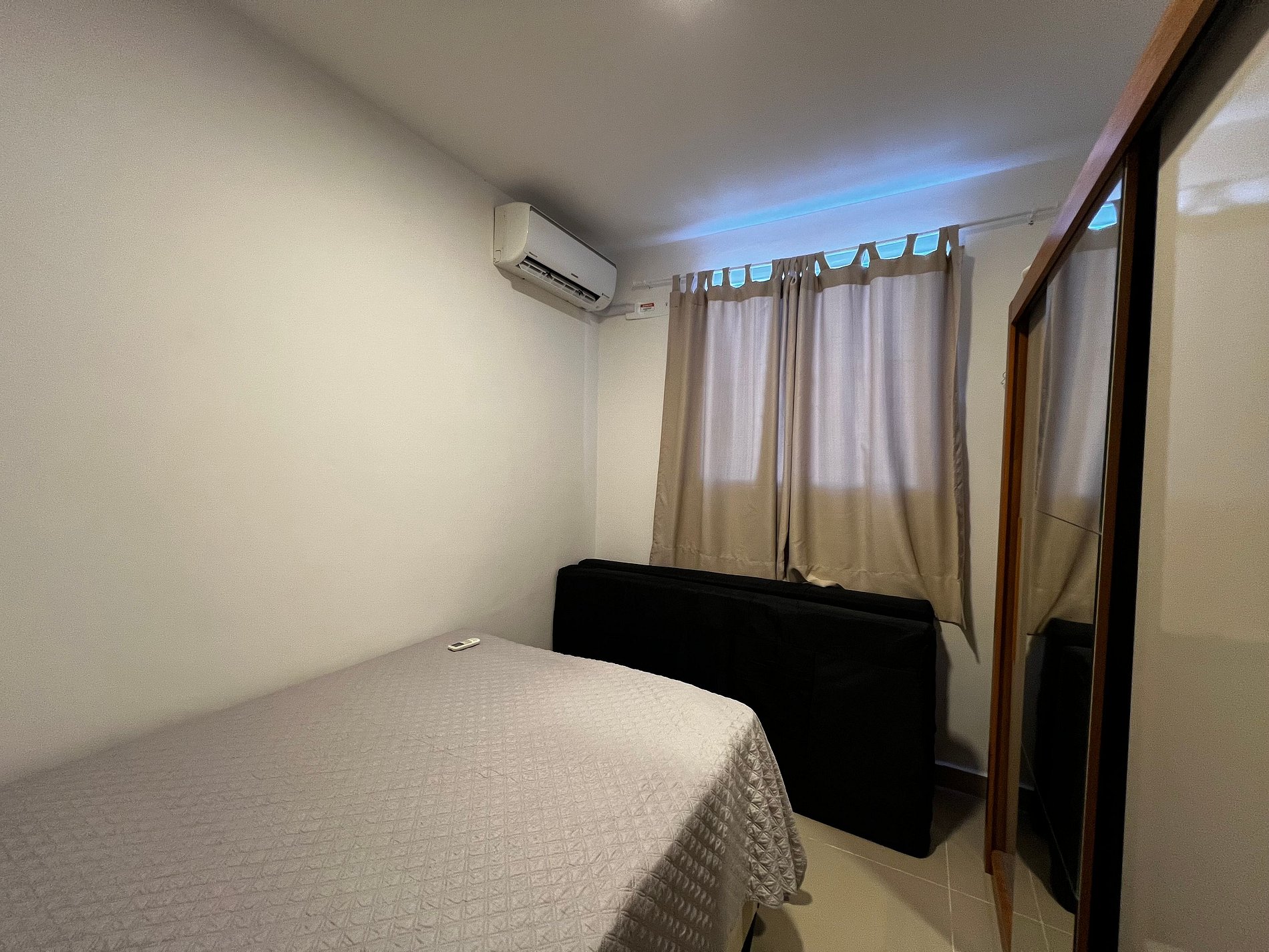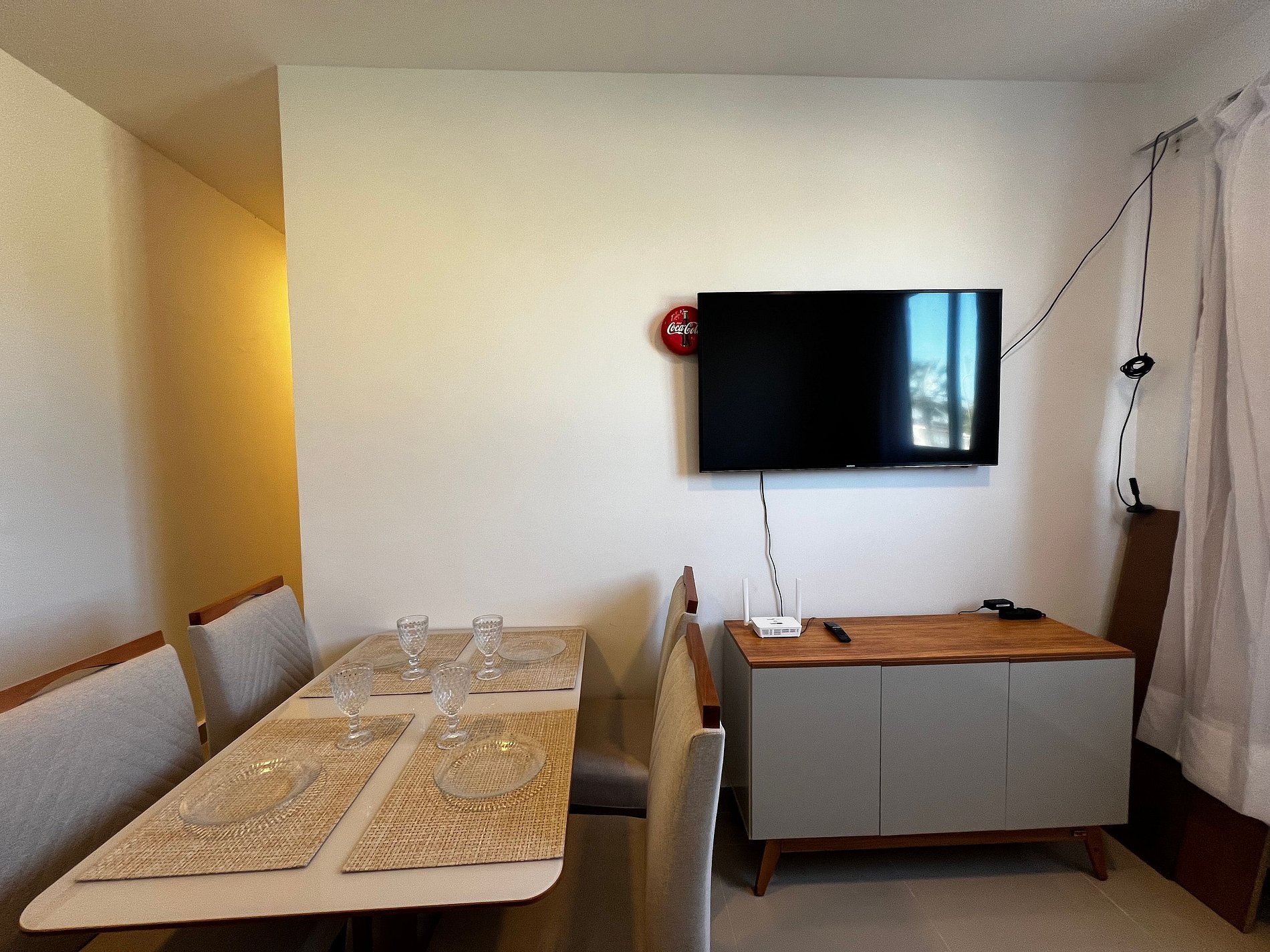 Apartamento de dois quartos, há menos de 1 km da praia de Ponta de Campina, ambos climatizados com ar condicionado e equipados com cama de casal. Na sala, uma tv, ventilador e sofa, banheiro social, cozinha compacta com utensílios essencias como fogão, geladeira e sanduicheira. Acomoda até 4 pessoas, ideal para família e grupo de amigos. O condomínio é incrível, com piscina no térreo, espaço grande e arejado, cadeiras, garagem fixa e portaria 24 horas.