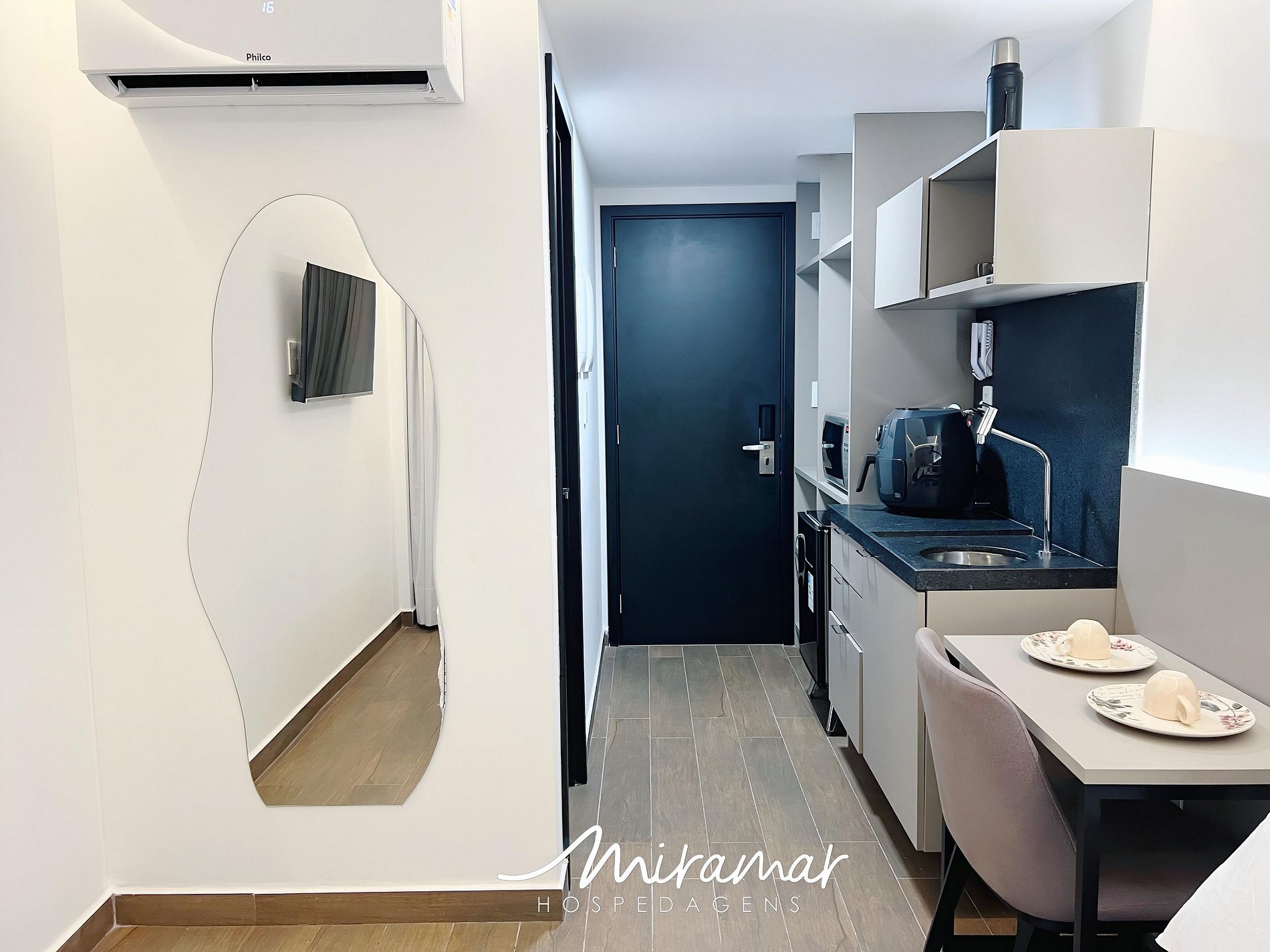 Na cozinha compacta, você encontrará todos os eletrodomésticos necessários para preparar refeições práticas, como air fryer, micro-ondas, liquidificador e frigobar.