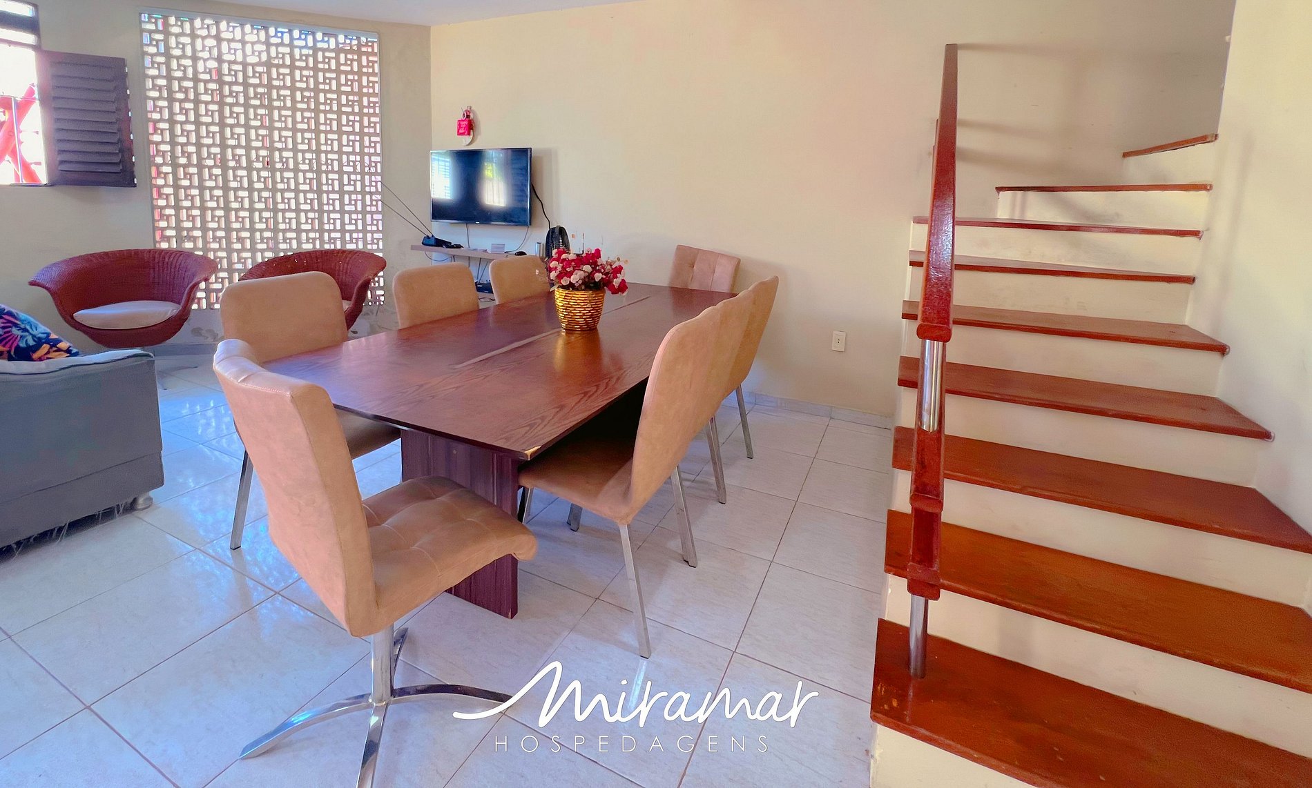 Casa ampla, com 5 suítes, um lavabo, sala e cozinha completa. No térreo, uma sala ampla com sofá, televisão, duas cadeiras e ventilador, e a primeira súite, com cama de casal e ar-condicionado. O lavabo, fica em frente a este primeio quarto. A cozinha é completa, com geladeira, fogão, microondas, sanduicheira e tudo que você precisa para o preaparo de refeições básicas a refeições mais elaboradas. No andar superior da casa, você encontrá outras 4 suítes, todas climatizadas com ar-condicionado e camas de casal. Um dos quartos terá duas camas de casal os outros 3, todos com uma cama de casal. No momento, não há água quente nos chuveiros.
