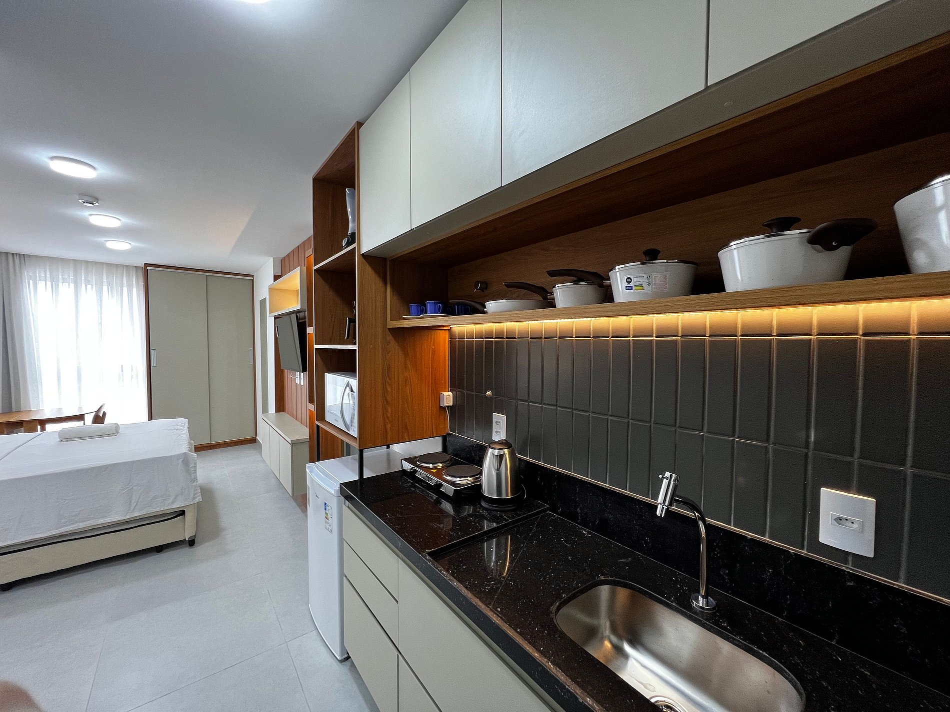 A cozinha compacta é um verdadeiro destaque, equipada com utensílios essenciais como frigobar, cooktop, micro-ondas, sanduicheira, liquidificador, airfryer e cafeteira, permitindo preparar refeições rápidas e deliciosas. O ambiente também inclui mesa e cadeiras e enxoval de cama e banho, para seu conforto.