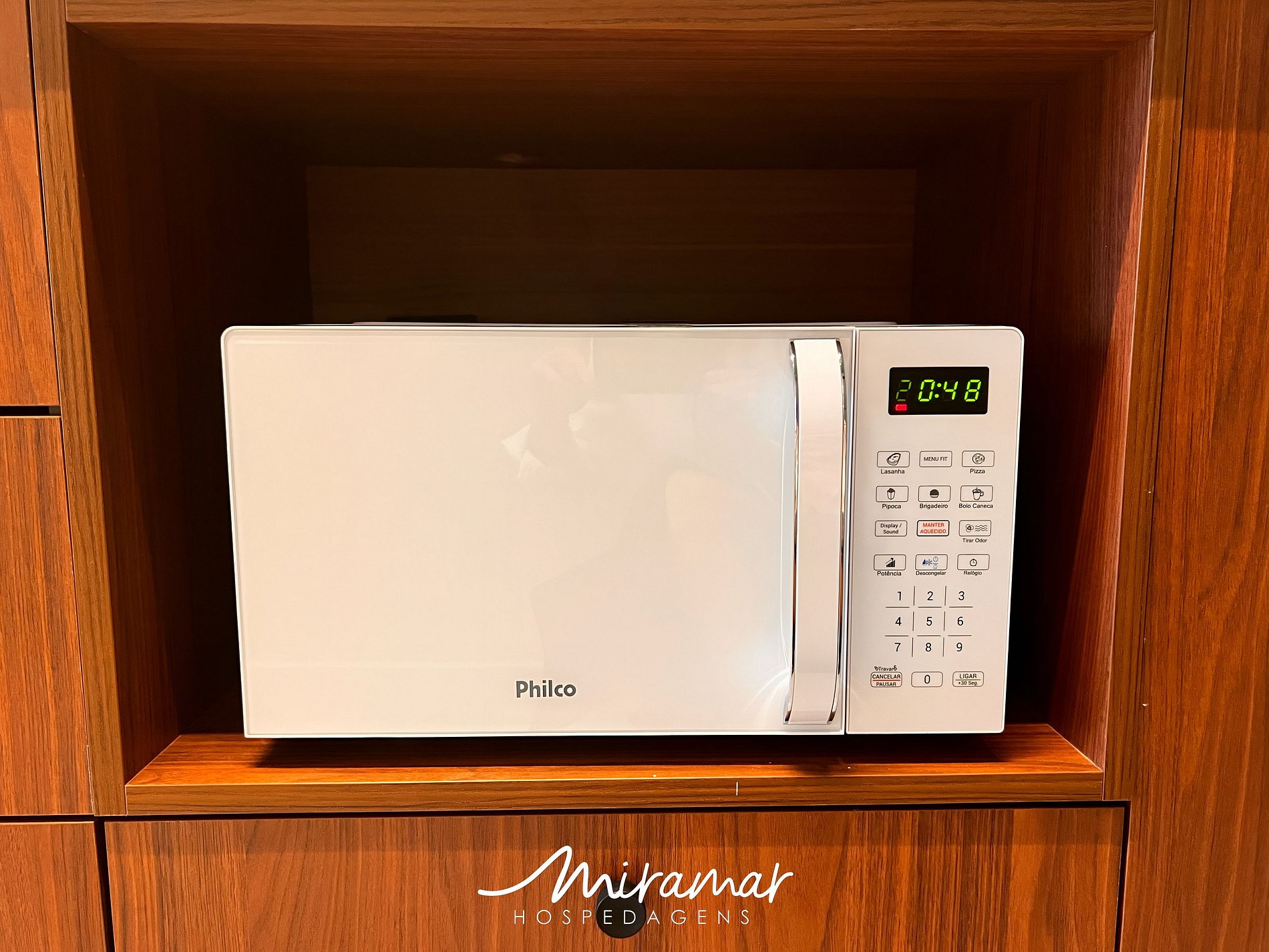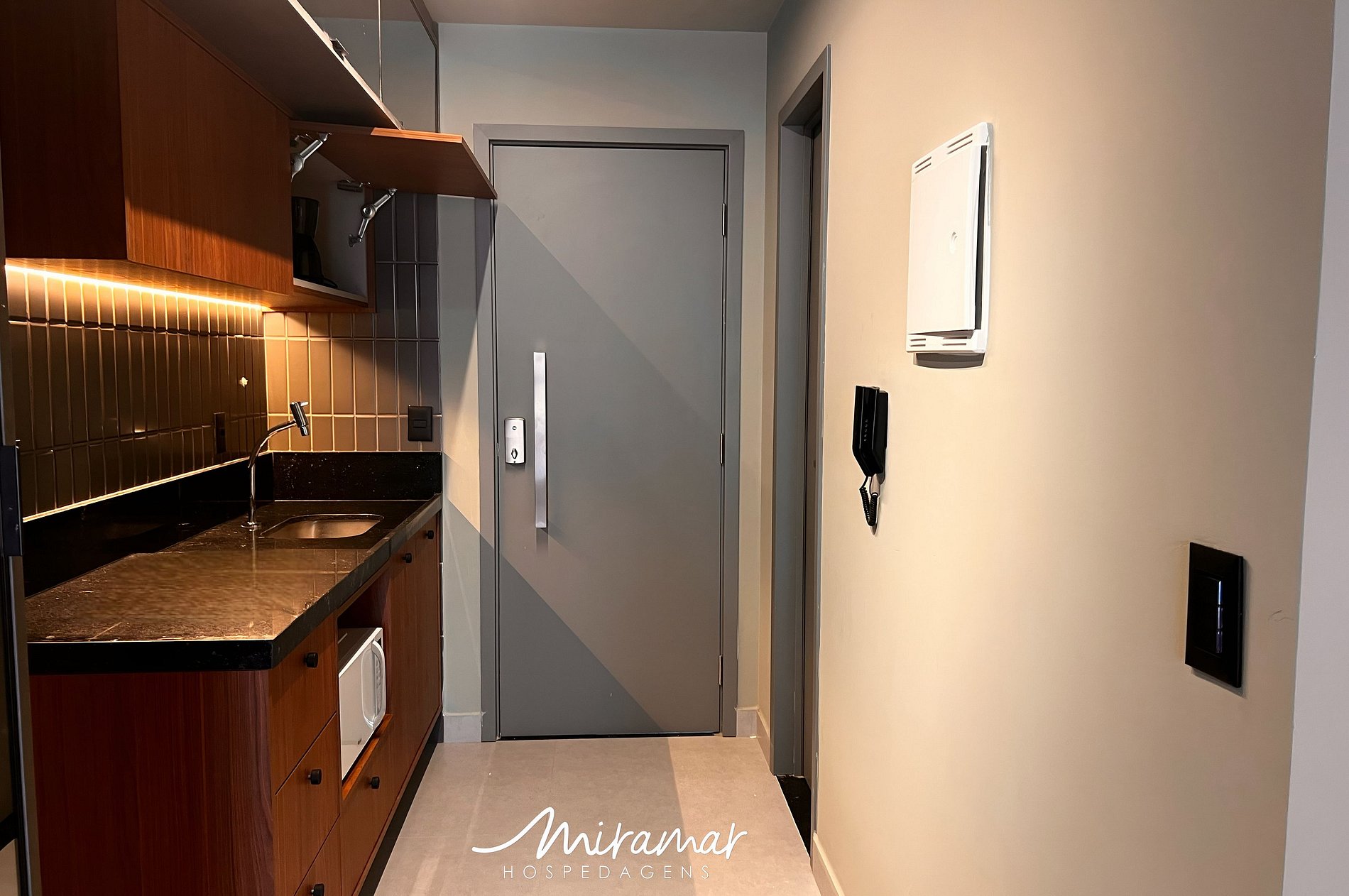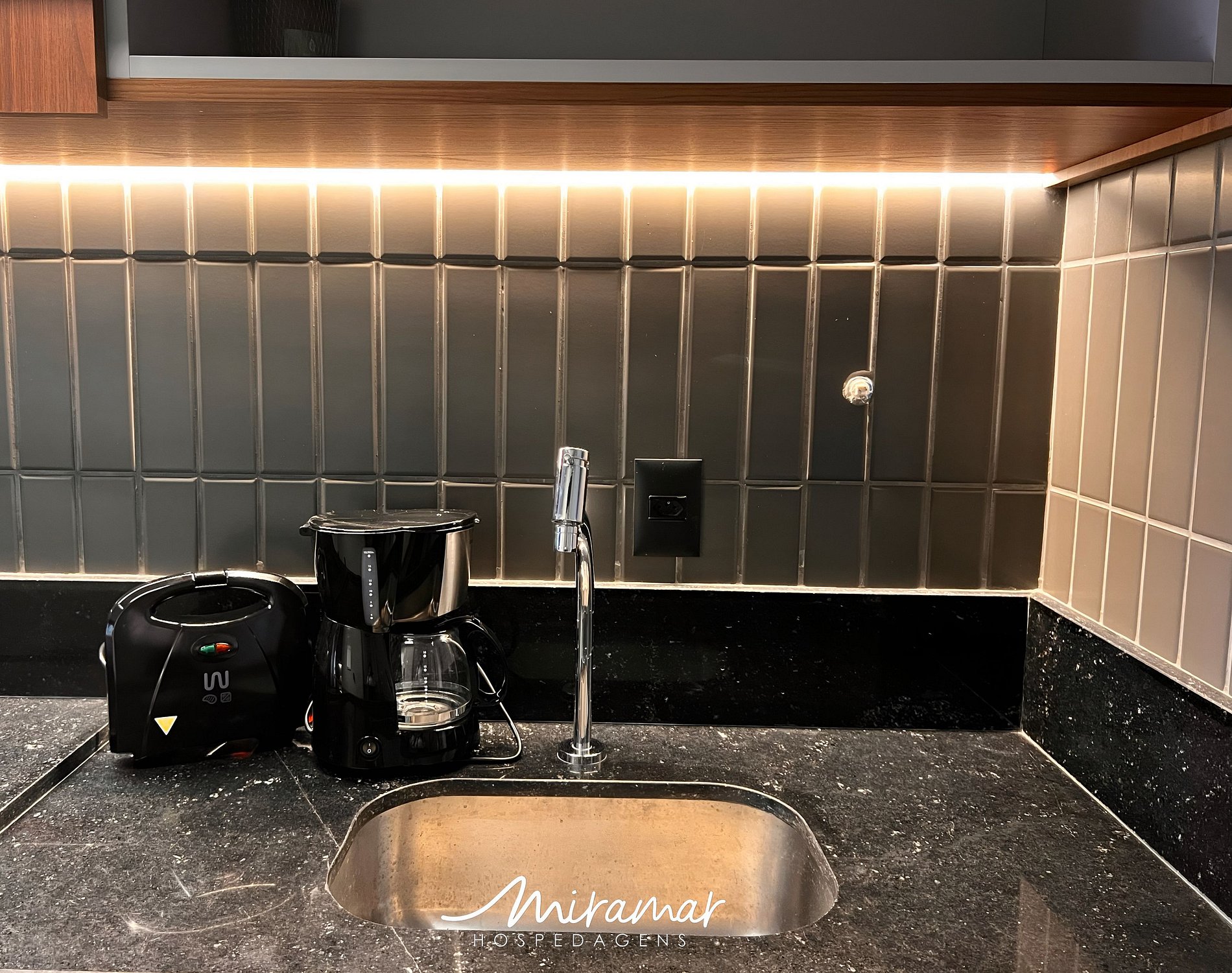 A cozinha compacta é equipada com frigo bar, cafeteira, sanduicheira, louças e talheres para até duas pessoas, perfeita para refeições rápidas. Tudo foi pensado para unir conforto e funcionalidade em sua estadia.