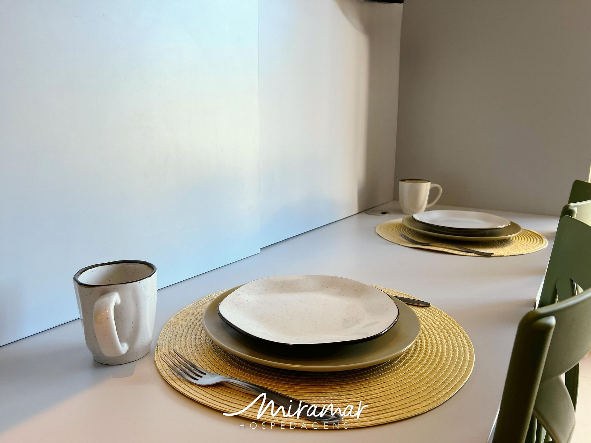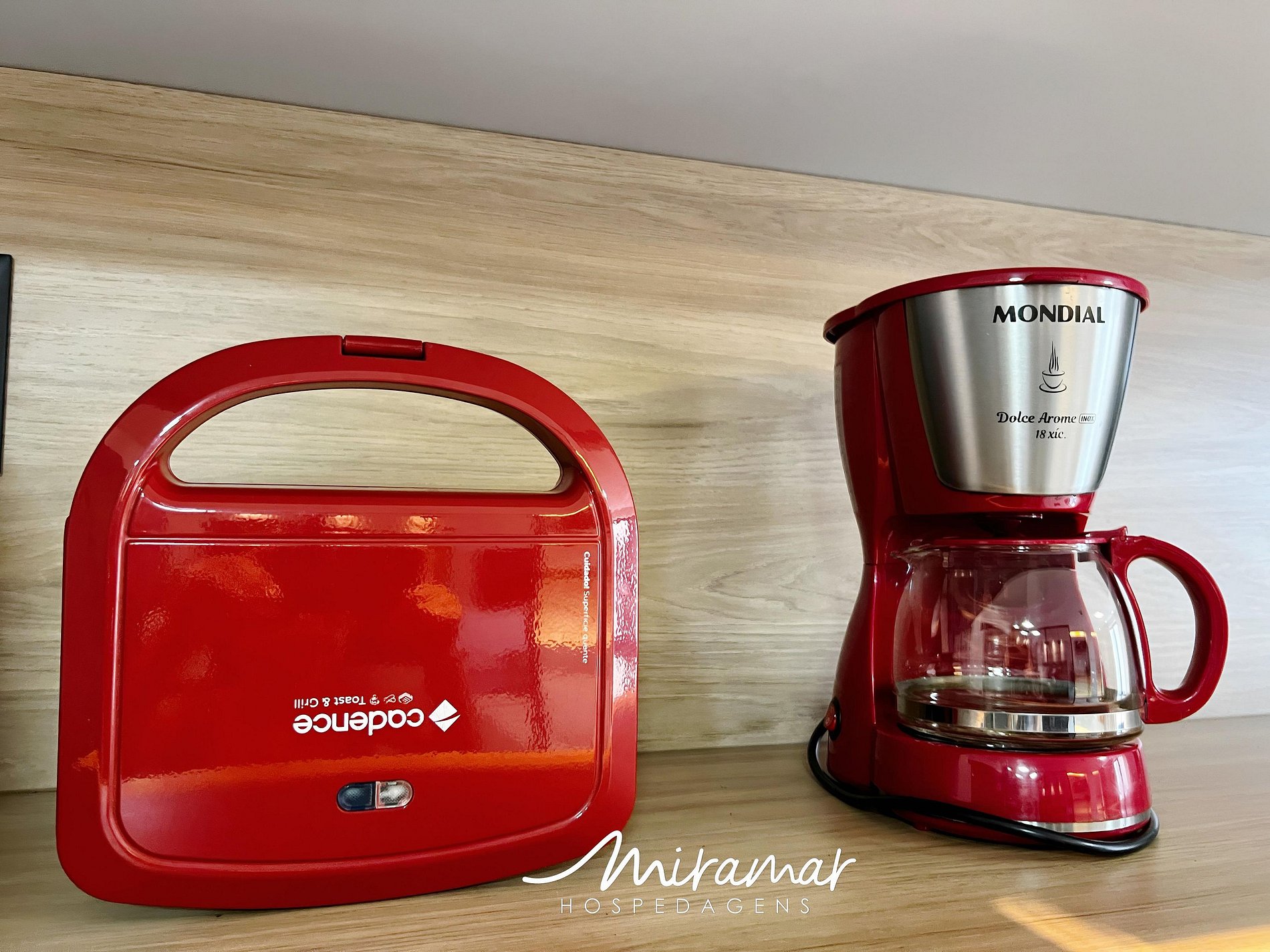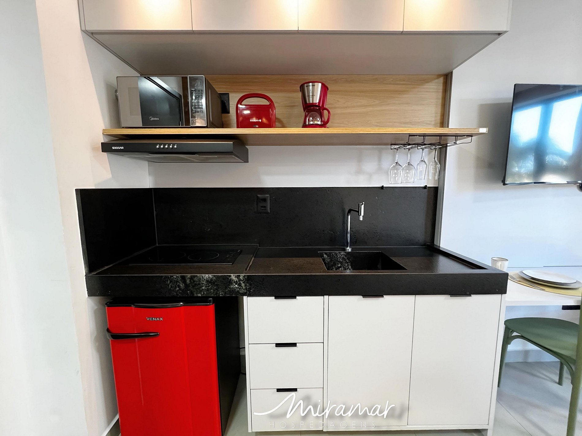 A cozinha, dispõe de eletrodomésticos modernos, como frigobar, cafeteira, cooktop de indução, coifa e micro-ondas, facilitando a preparação de refeições rápidas e práticas. Além disso, oferecemos um enxoval de cama e banho que inclui lençóis e toalhas, para que você tenha tudo o que precisa para uma estadia confortável e agradável.