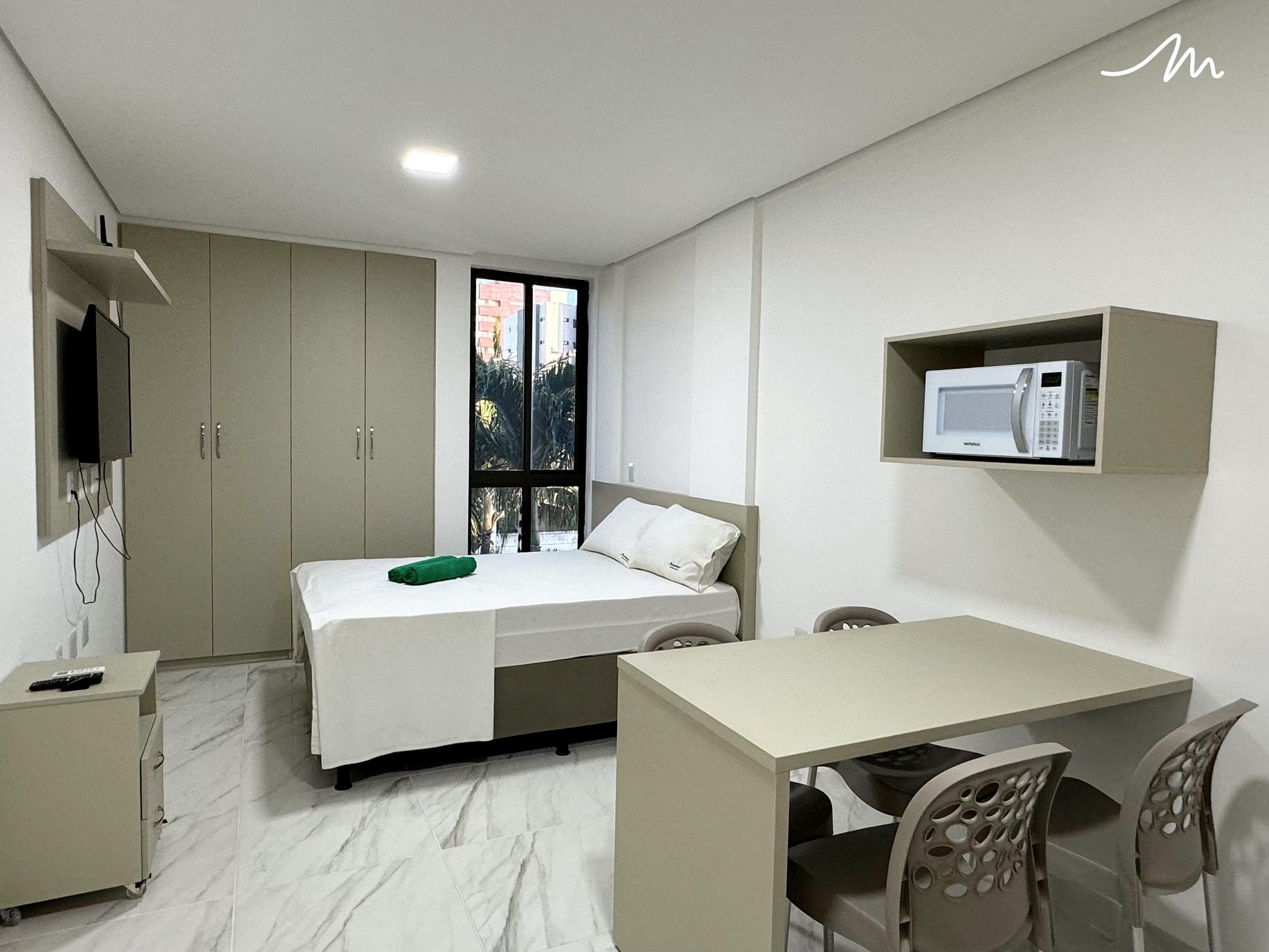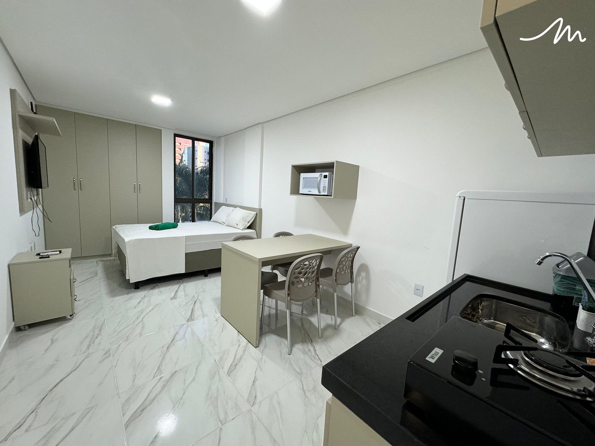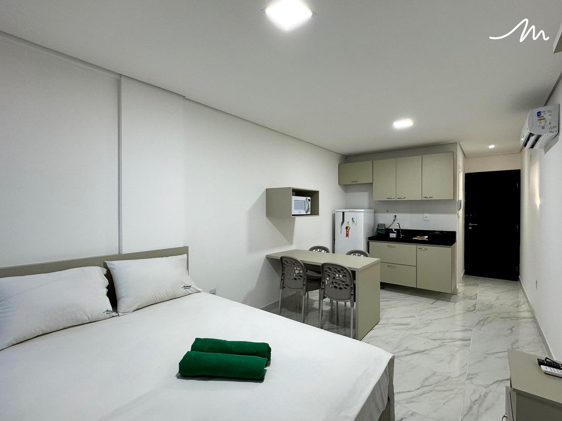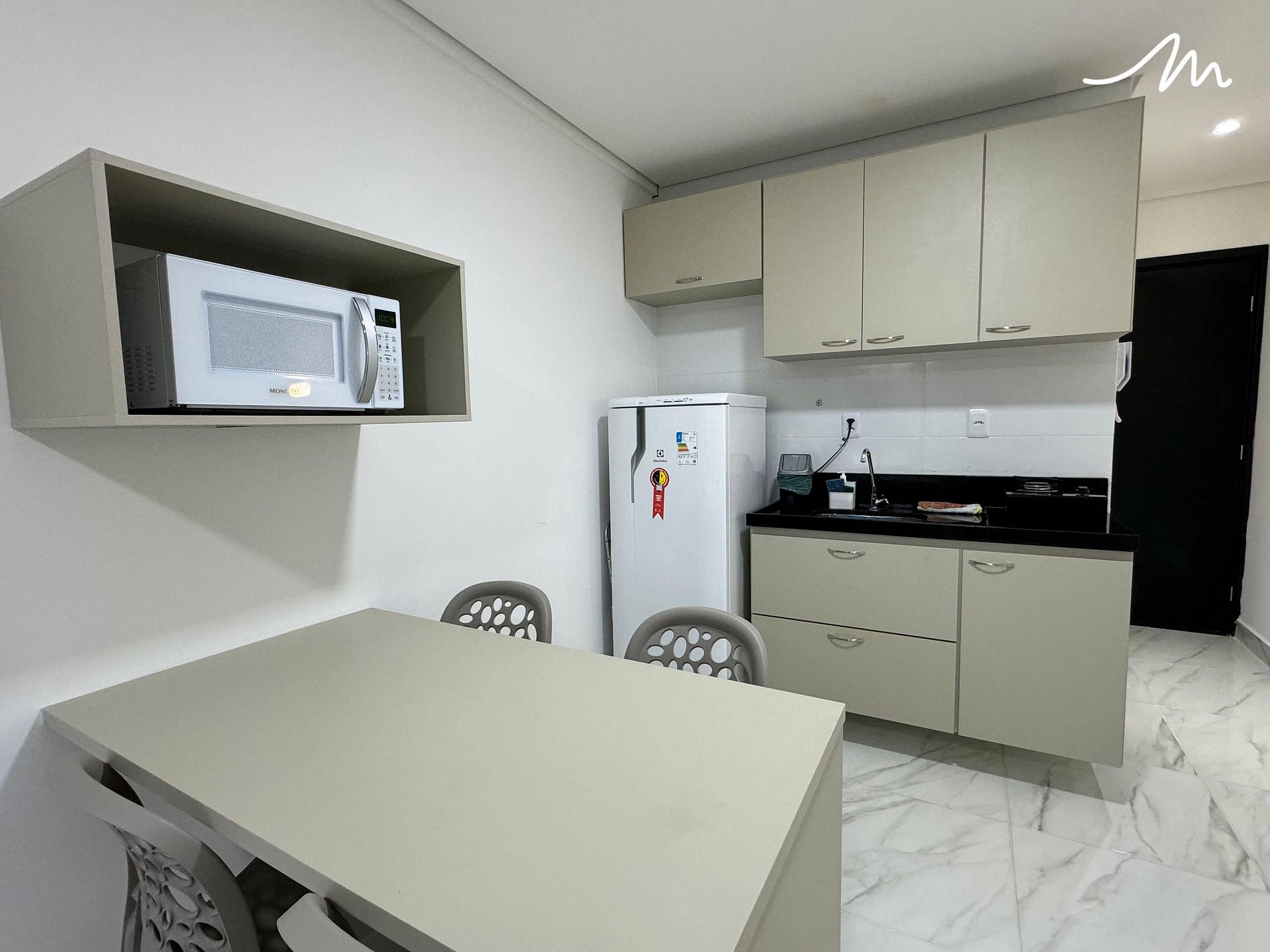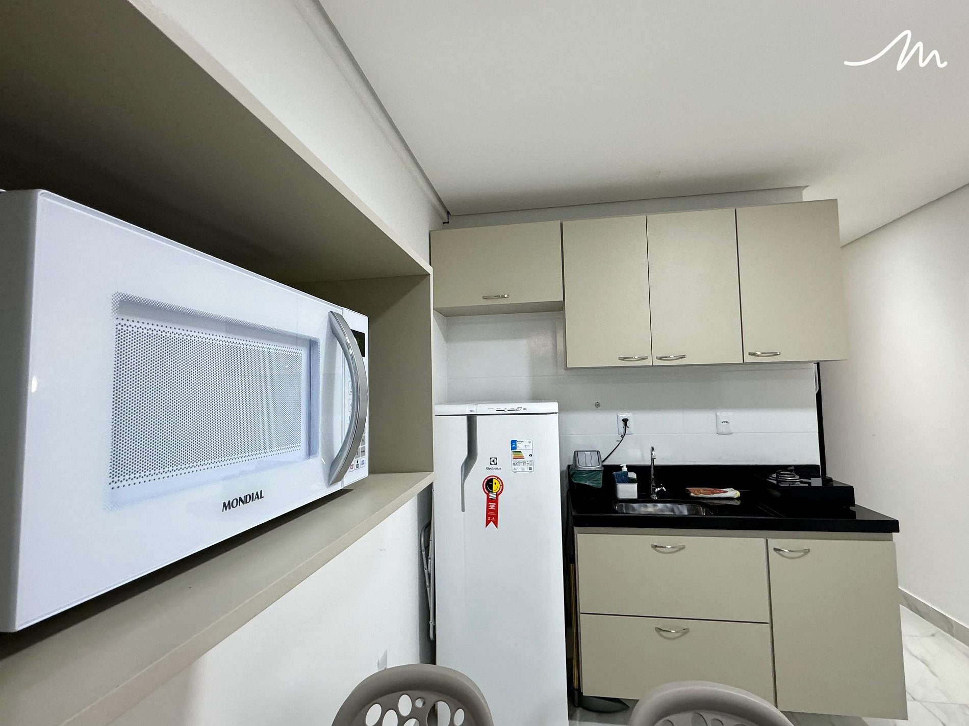 A cama de casal oferece o descanso merecido, enquanto a Smart TV proporciona entretenimento para os momentos de lazer. A cozinha compacta, equipada com geladeira, fogão elétrico de uma boca e micro-ondas, tem tudo que você precisa para preparar uma refeição rápida e prática. O guarda-roupa com cabides proporciona organização, e a mesa com cadeiras é o local ideal para refeições ou para organizar seus planos para o dia seguinte.